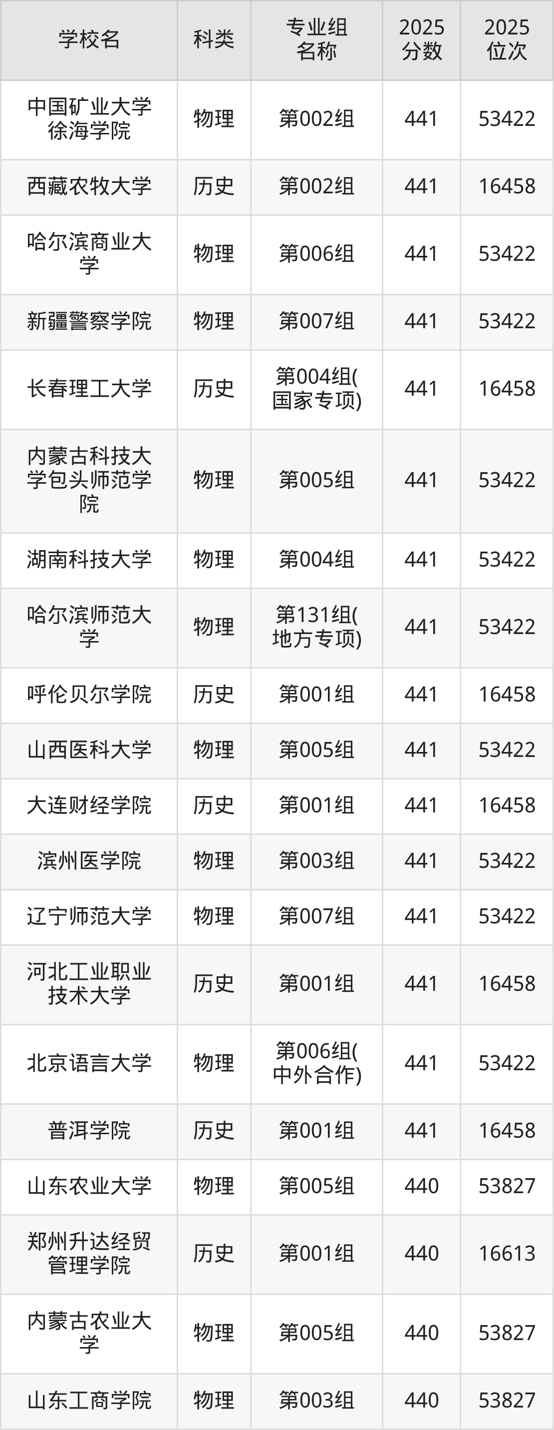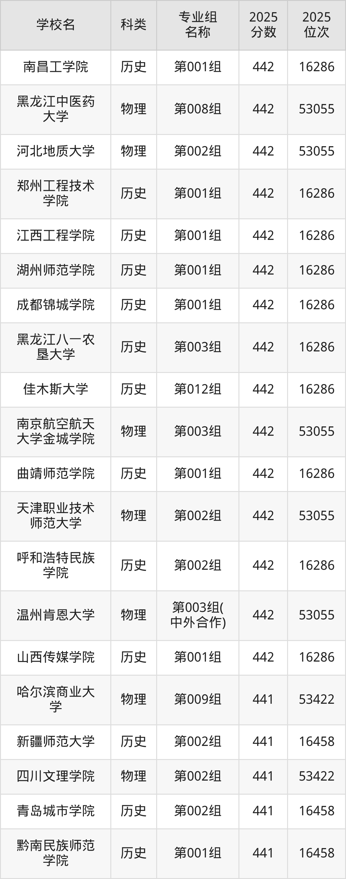 2025年黑龙江历史类本科线为405分,442分能上的本科大学共计241所,其中公办大学录取位次排名最低的是湖南科技大学(第001组405分,位次22977名),即代表考生省排名位次在22977名及以内就可以报考公办本科。