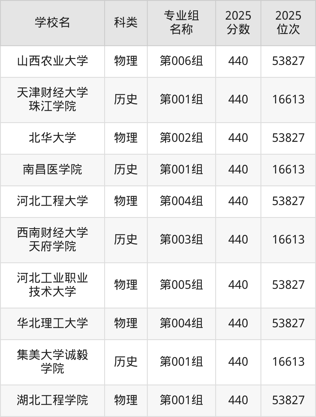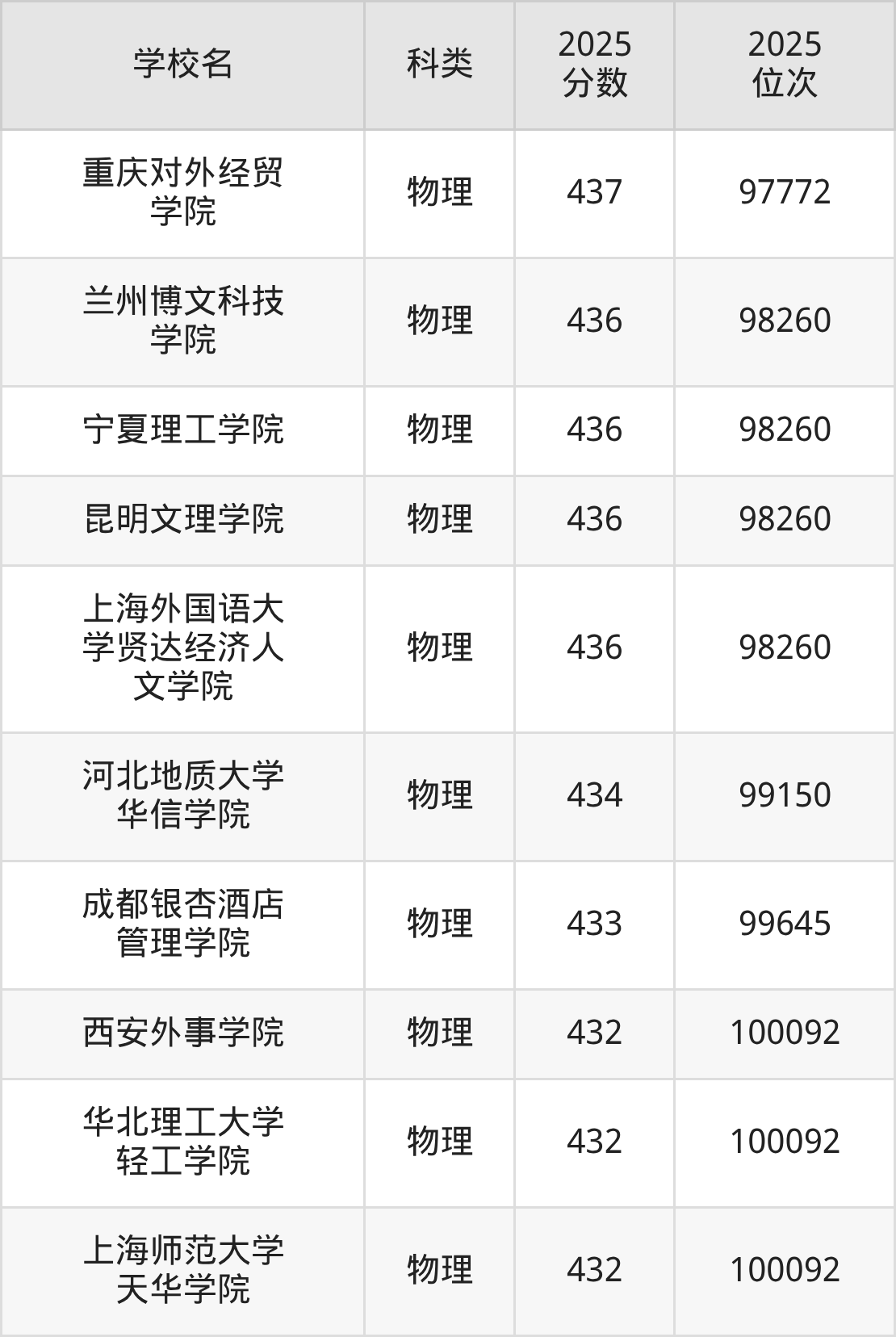 而位次最低的民办院校有桂林信息科技学院、西安交通工程学院、合肥城市学院、西安培华学院,分数为425分,对应最低位次排名为103219名。