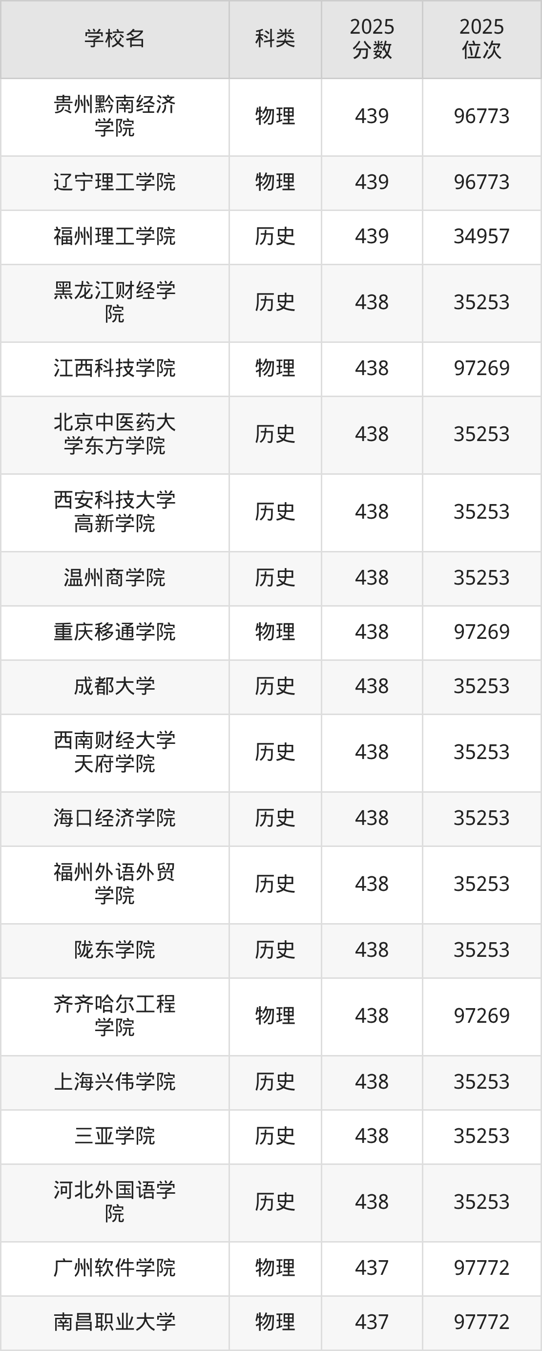 而位次最低的民办院校有西安科技大学高新学院、西南财经大学天府学院、福州外语外贸学院、河北外国语学院,分数为438分,对应最低位次排名为35253名。