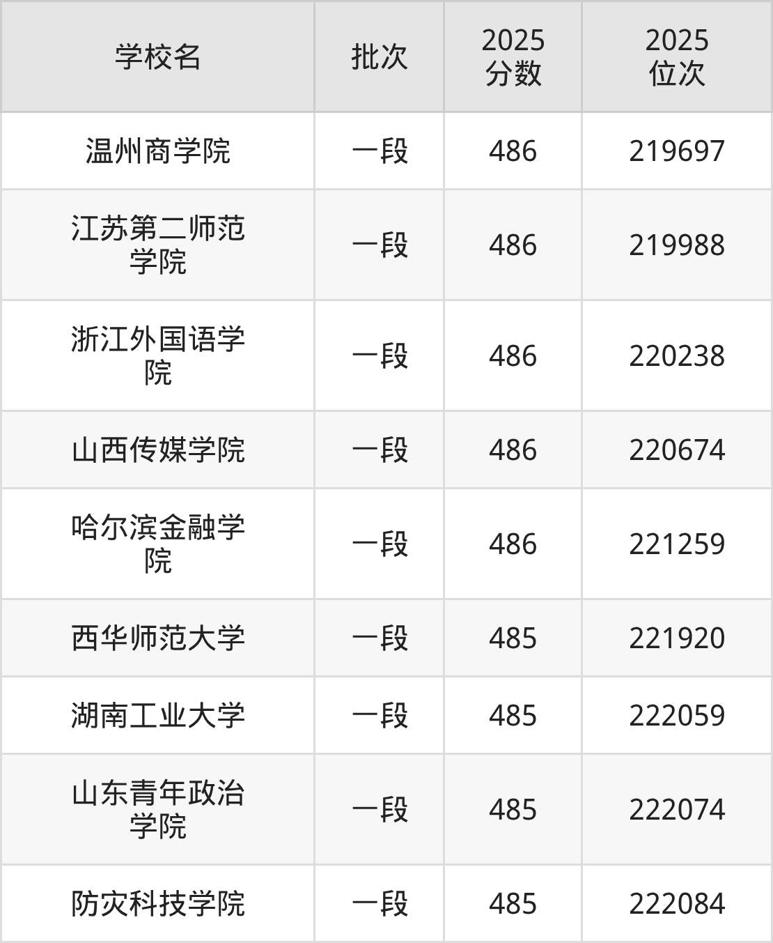 2025年山东高考486分(219214名~221738名)能上的大学有江苏第二师范学院、温州商学院、山西传媒学院、哈尔滨金融学院等。