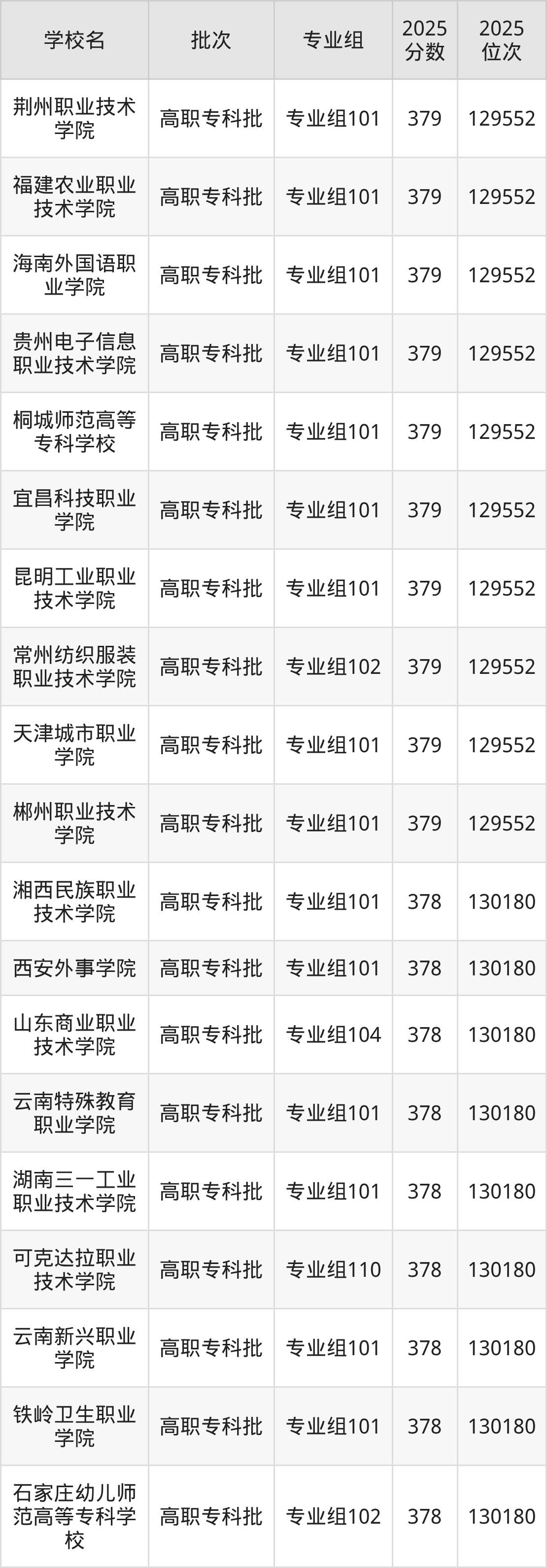 2025年四川高考历史类378分(129553名~130180名)能上的大学有石家庄幼儿师范高等专科学校专业组102、铁岭卫生职业学院专业组101、云南新兴职业学院专业组101、可克达拉职业技术学院专业组110等。