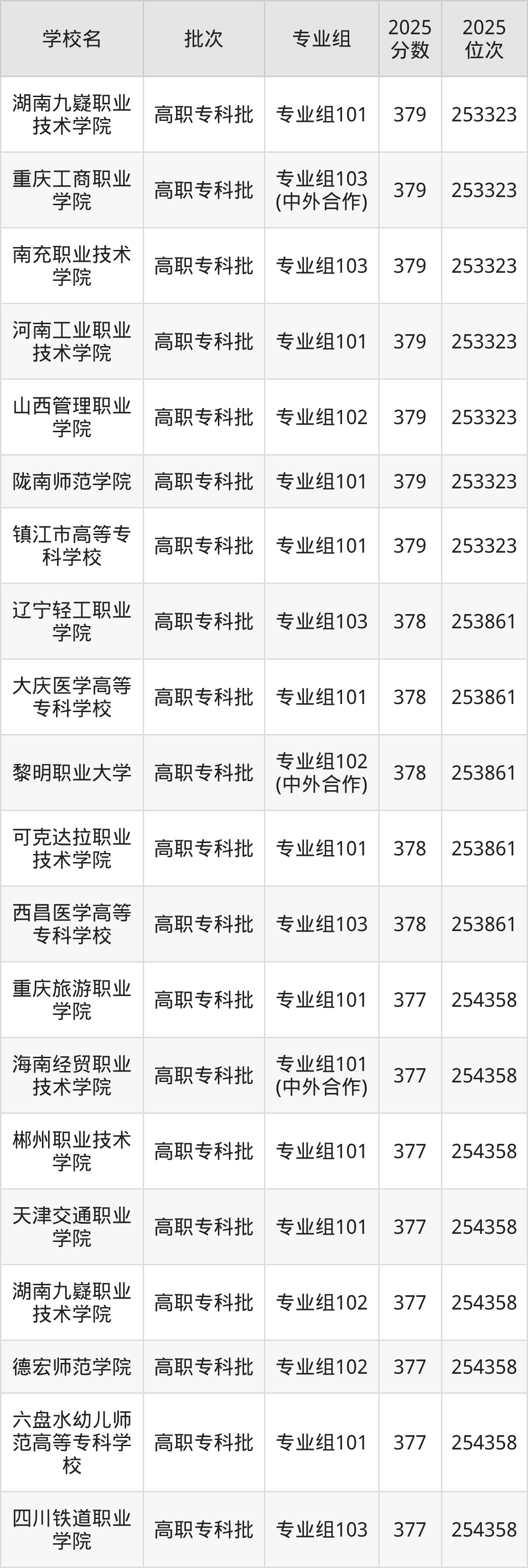 2025年四川高考物理类378分(253324名~253861名)能上的大学有黎明职业大学专业组102(中外合作)、可克达拉职业技术学院专业组101、辽宁轻工职业学院专业组103、西昌医学高等专科学校专业组103等。