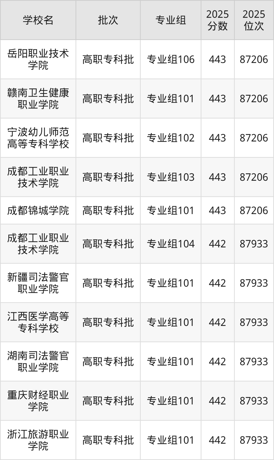 2025年四川高考历史类442分(87207名~87933名)能上的大学有新疆司法警官职业学院专业组101、江西医学高等专科学校专业组101、湖南司法警官职业学院专业组101、成都工业职业技术学院专业组104等。