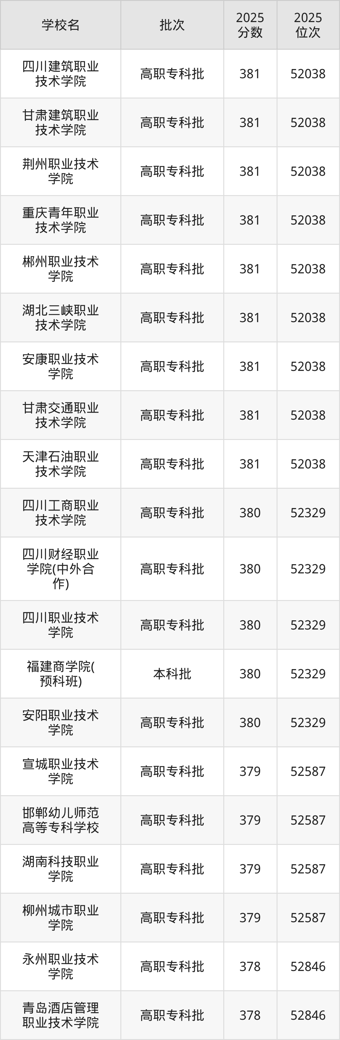 2025年重庆高考历史类379分(52330名~52587名)能上的大学有宣城职业技术学院、柳州城市职业学院、湖南科技职业学院、邯郸幼儿师范高等专科学校。