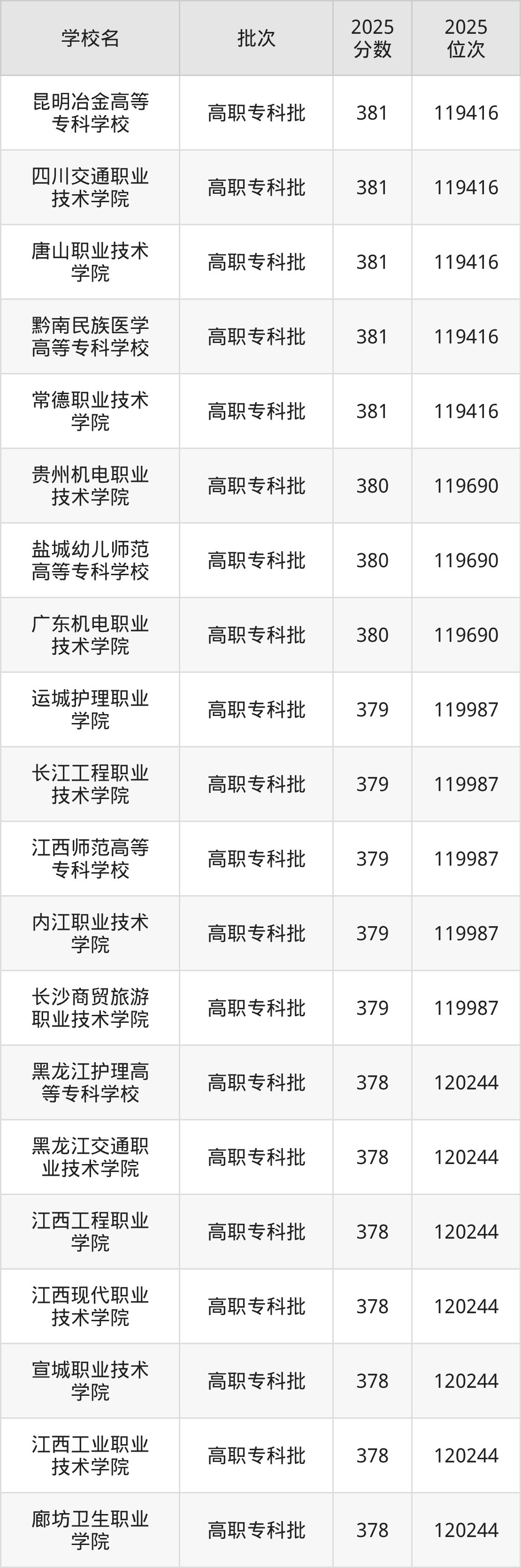 2025年重庆高考物理类379分(119691名~119987名)能上的大学有长沙商贸旅游职业技术学院、内江职业技术学院、江西师范高等专科学校、长江工程职业技术学院等。