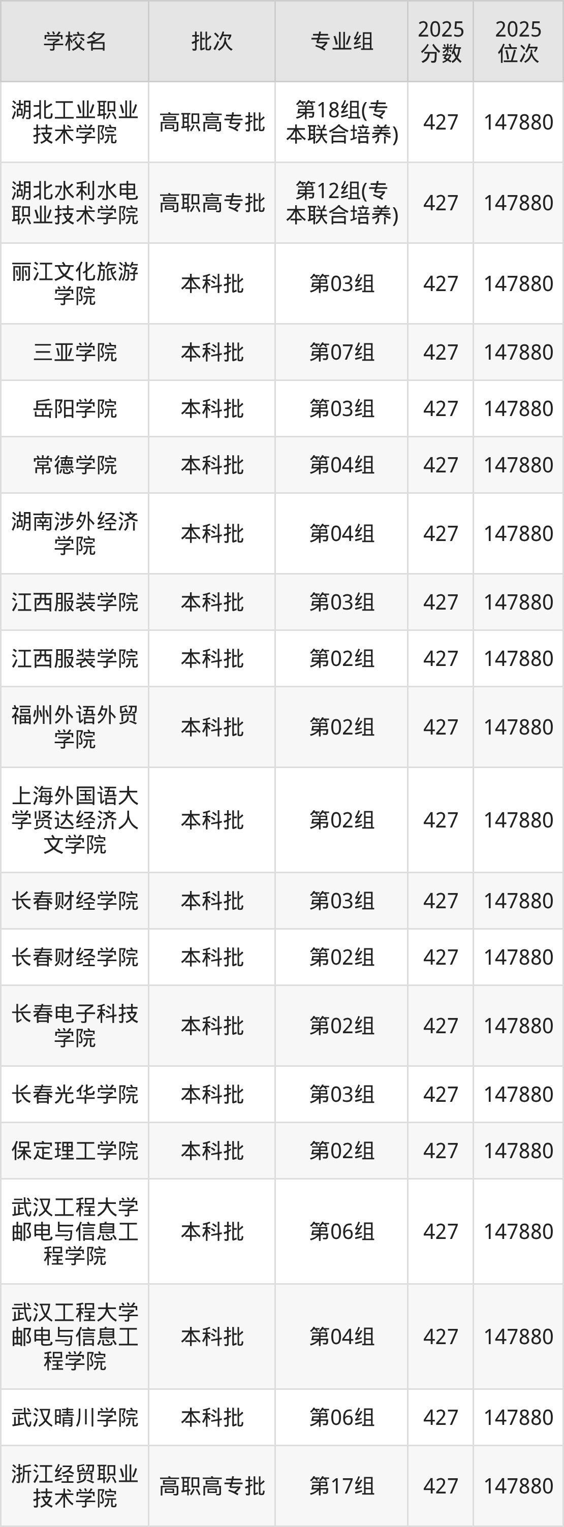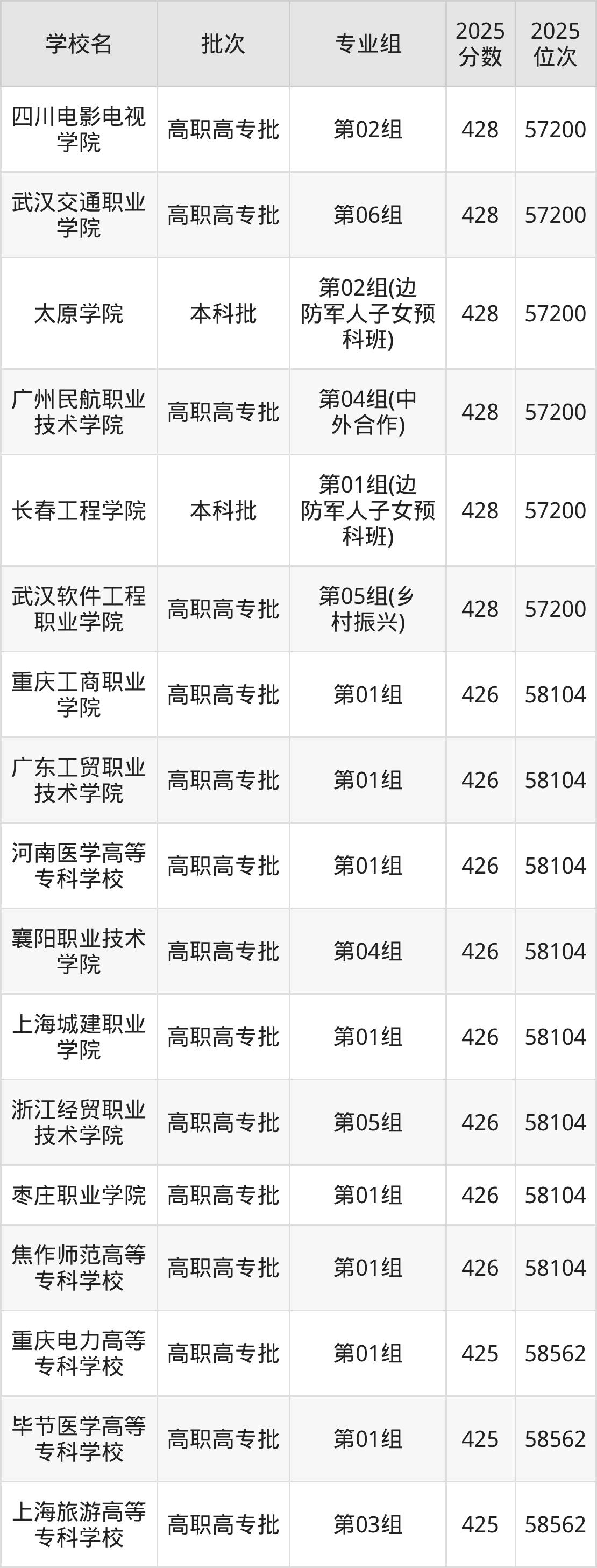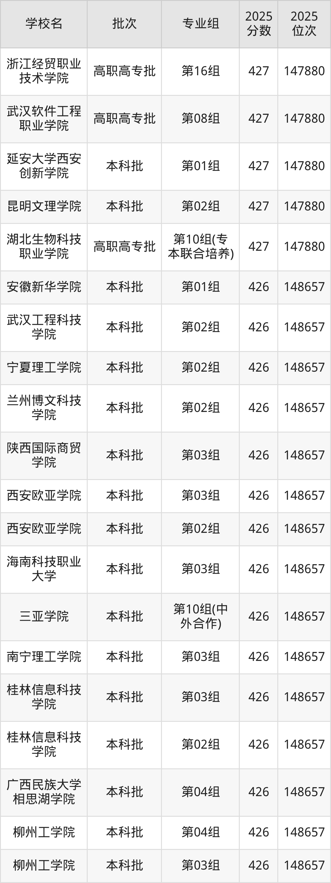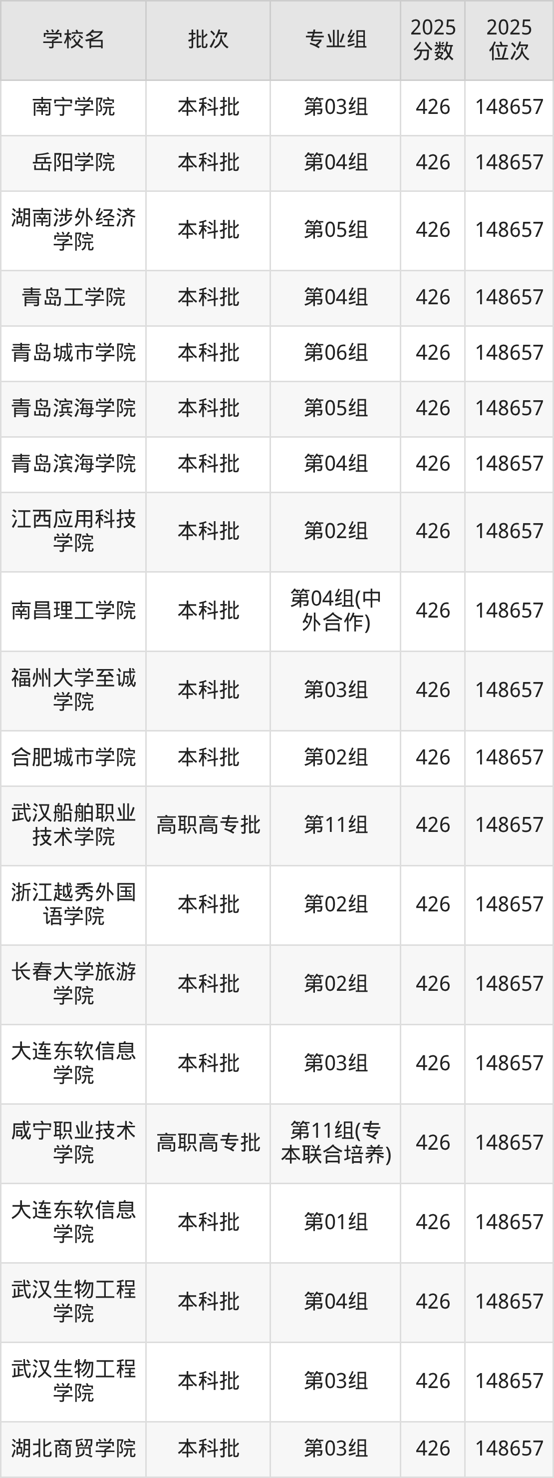 2025年湖北高考历史类426分(57631名~58104名)能上的大学有襄阳职业技术学院第04组、上海城建职业学院第01组、浙江经贸职业技术学院第05组、枣庄职业学院第01组等。