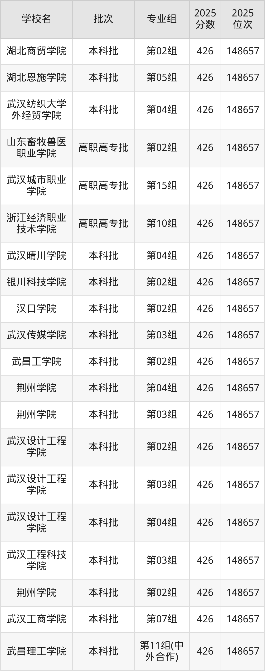 2025年湖北高考物理类426分(147881名~148657名)能上的大学有武汉晴川学院第04组、汉口学院第02组、武汉传媒学院第03组、武汉设计工程学院第02组等。
