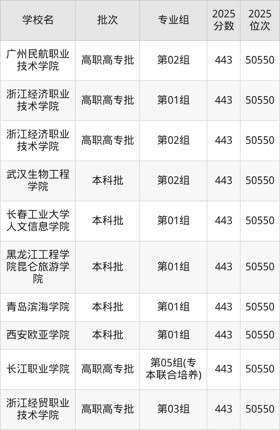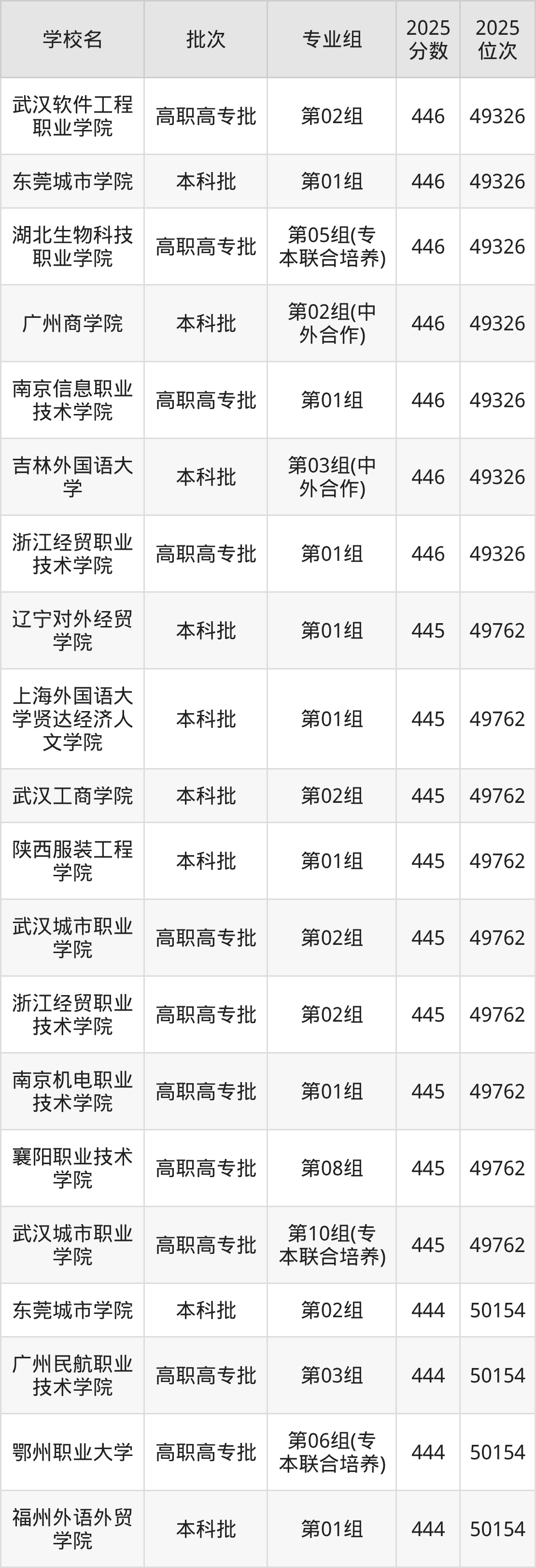 2025年湖北高考历史类444分(49763名~50154名)能上的大学有福州外语外贸学院第01组、东莞城市学院第02组、鄂州职业大学第06组(专本联合培养)、广州民航职业技术学院第03组。