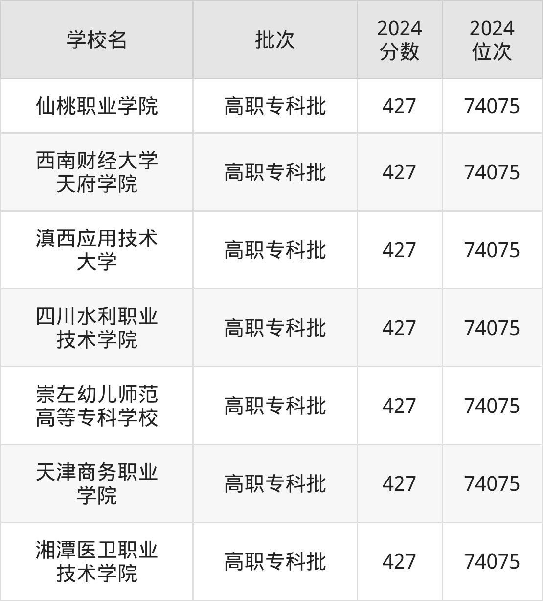 2024年云南高考文科427分(73506名~74075名)能上的大学有仙桃职业学院、湘潭医卫职业技术学院、四川水利职业技术学院、西南财经大学天府学院等。