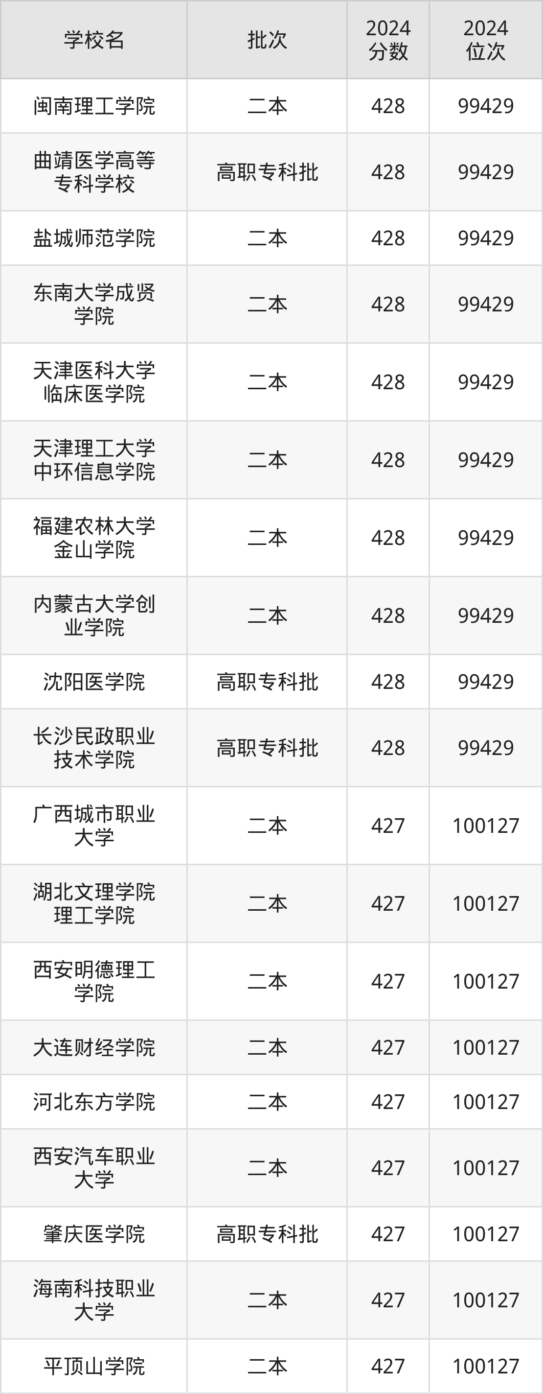 这些都是2025年高考理科99430名~100127名考生可以报考的大学,更多学校名单如下表所示: