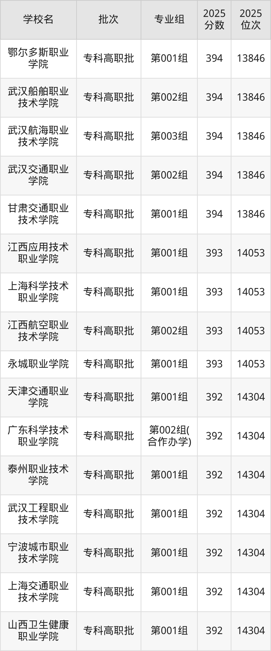 2025年山西高考历史类394分(13609名~13846名)能上的大学有鄂尔多斯职业学院第001组、吉林工业职业技术学院第001组、武汉船舶职业技术学院第002组、武汉航海职业技术学院第003组等。