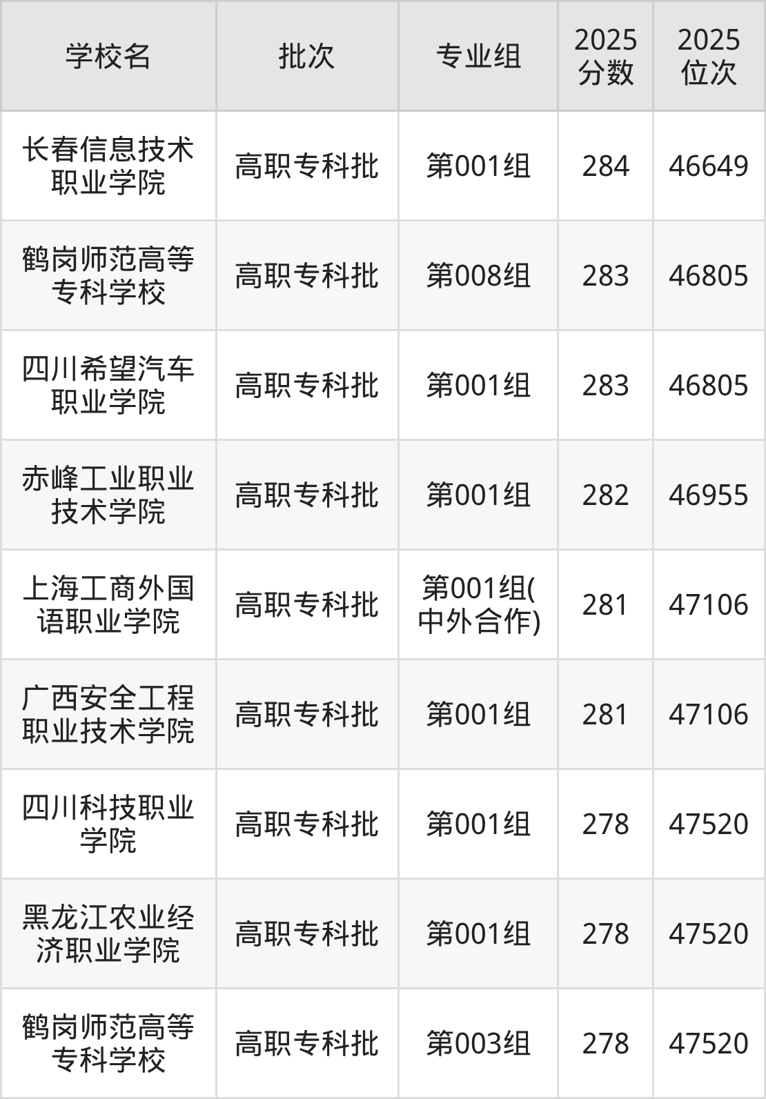2025年黑龙江高考历史类281分(46956名~47106名)能上的大学有上海工商外国语职业学院第001组(中外合作)、广西安全工程职业技术学院第001组。