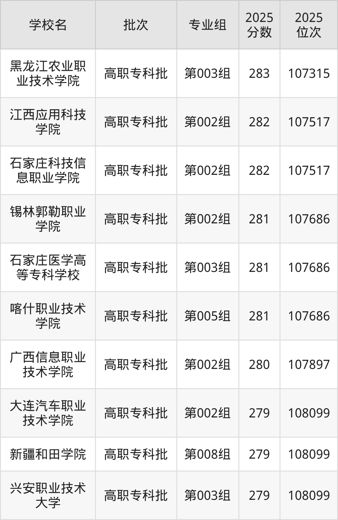 2025年黑龙江高考物理类281分(107518名~107686名)能上的大学有石家庄医学高等专科学校第003组、锡林郭勒职业学院第002组、喀什职业技术学院第005组。