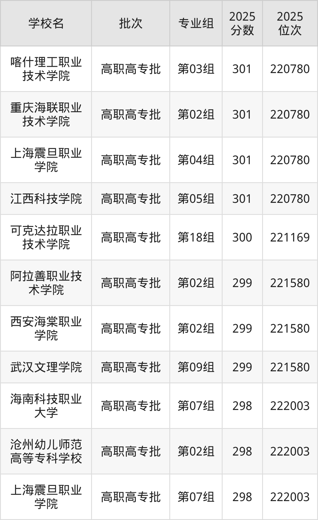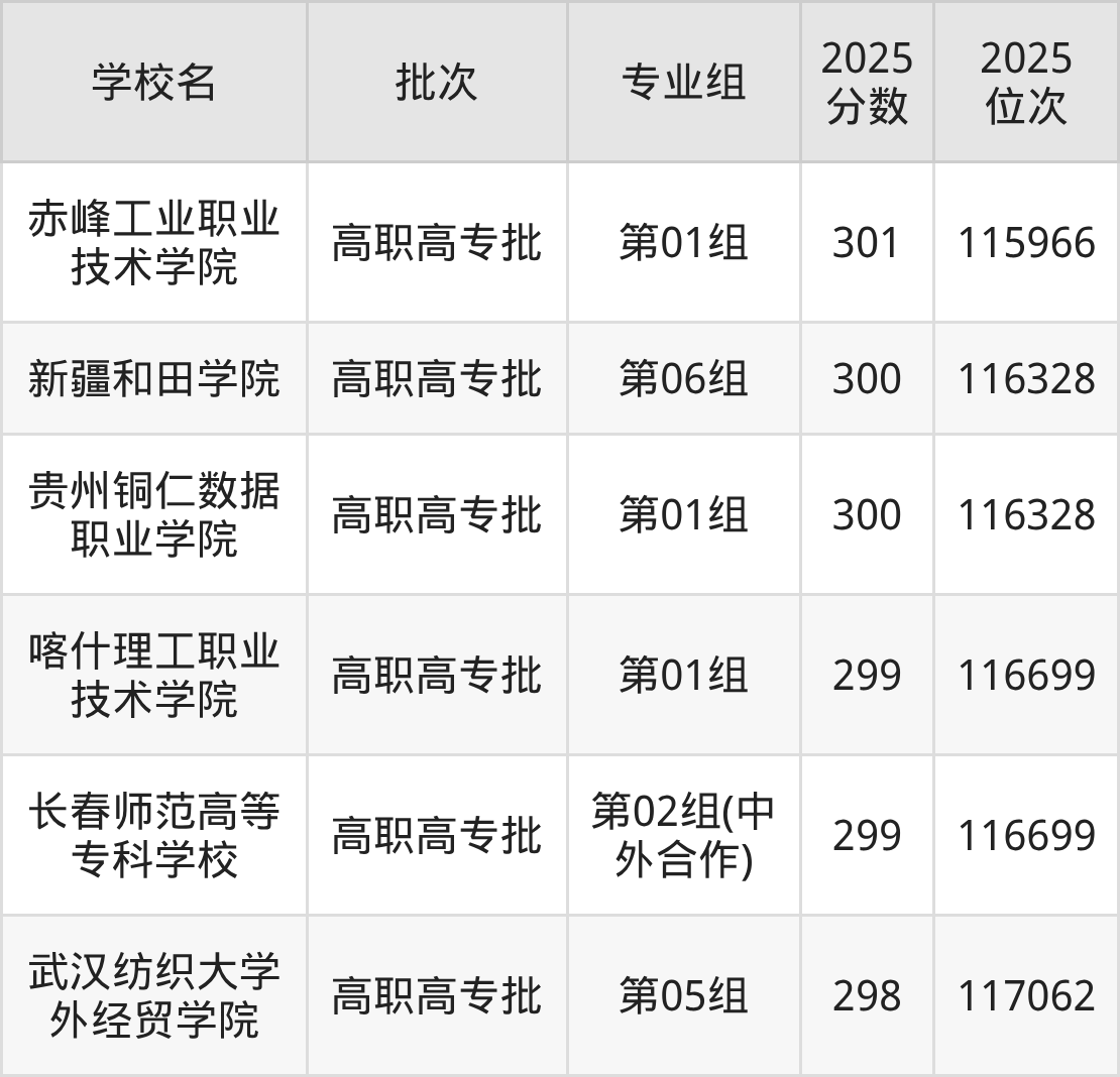 2025年湖北高考历史类299分(116329名~116699名)能上的大学有长春师范高等专科学校第02组(中外合作)、喀什理工职业技术学院第01组。