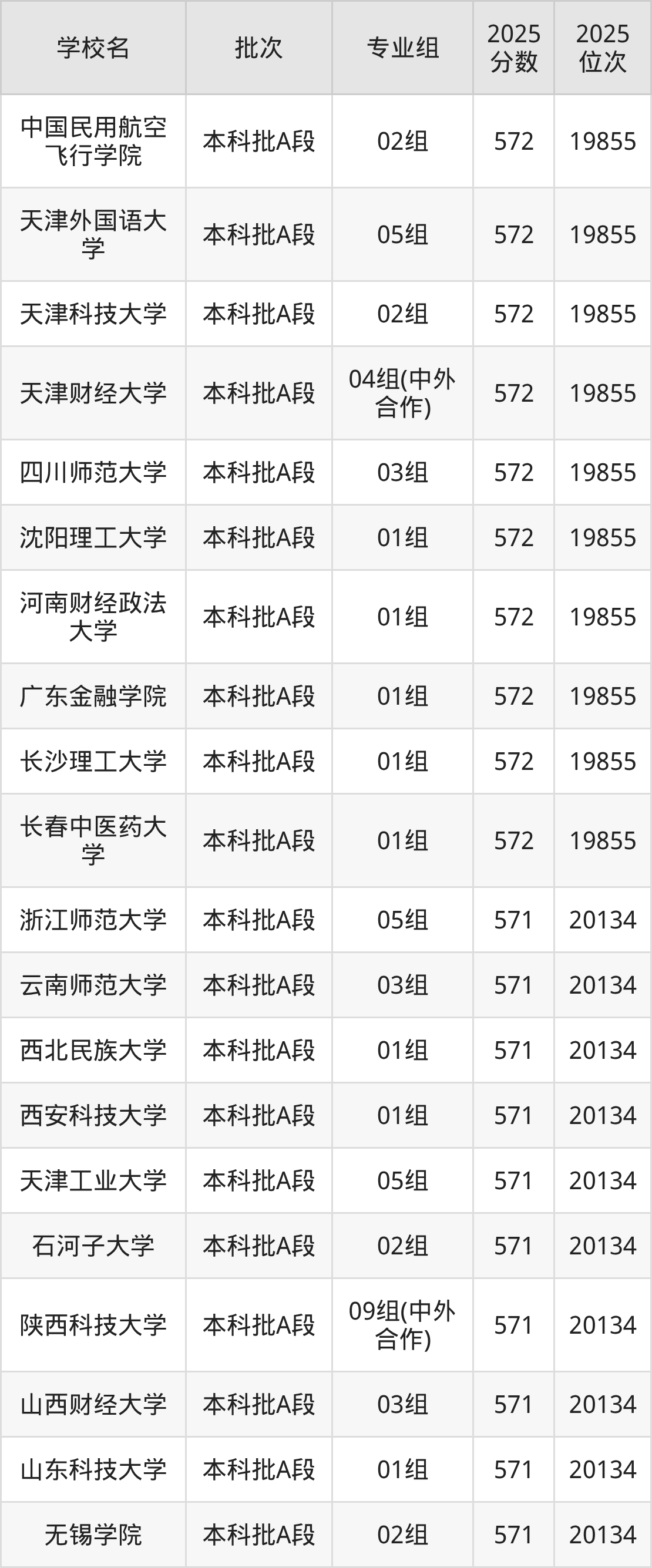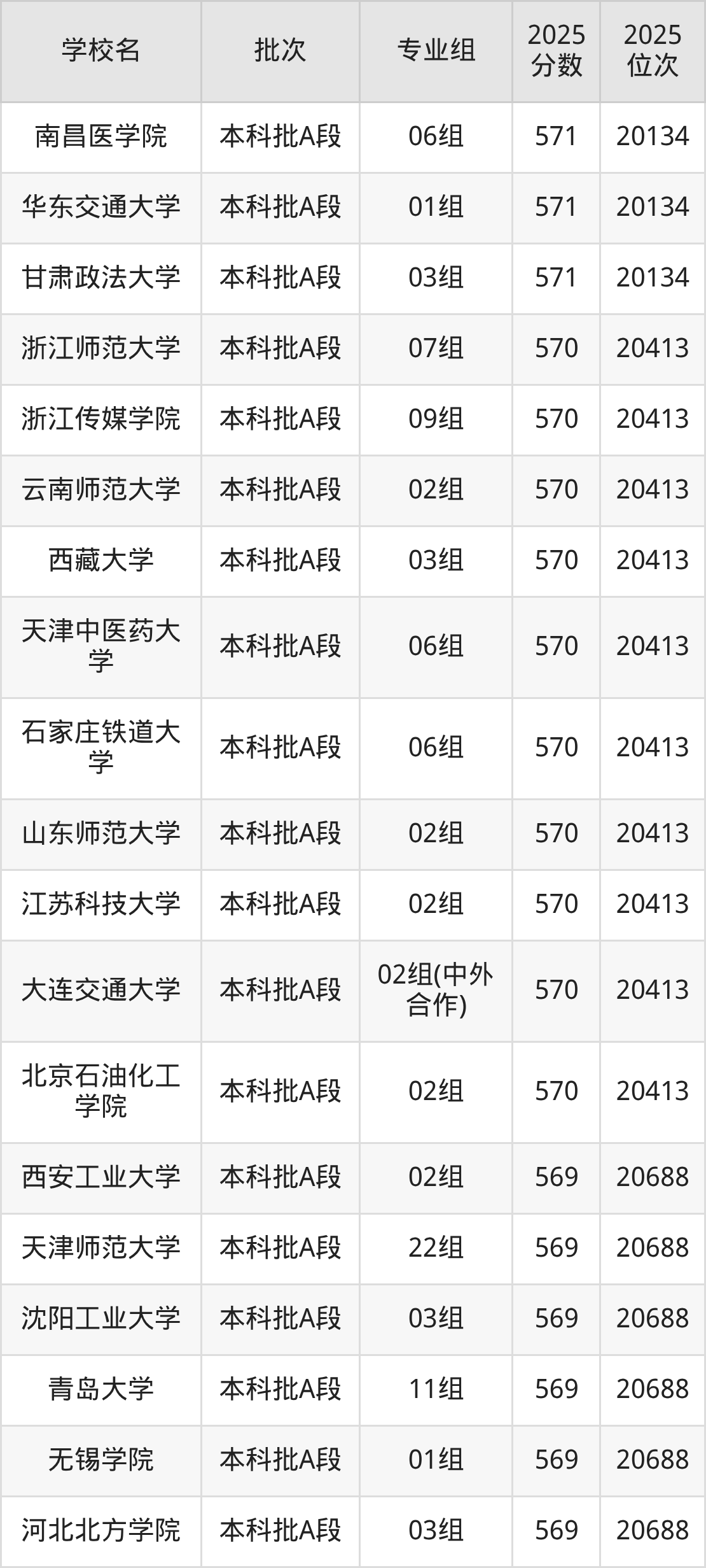 2025年天津高考570分(20135名~20413名)能上的大学有北京石油化工学院02组、大连交通大学02组(中外合作)、江苏科技大学02组、山东师范大学02组等。
