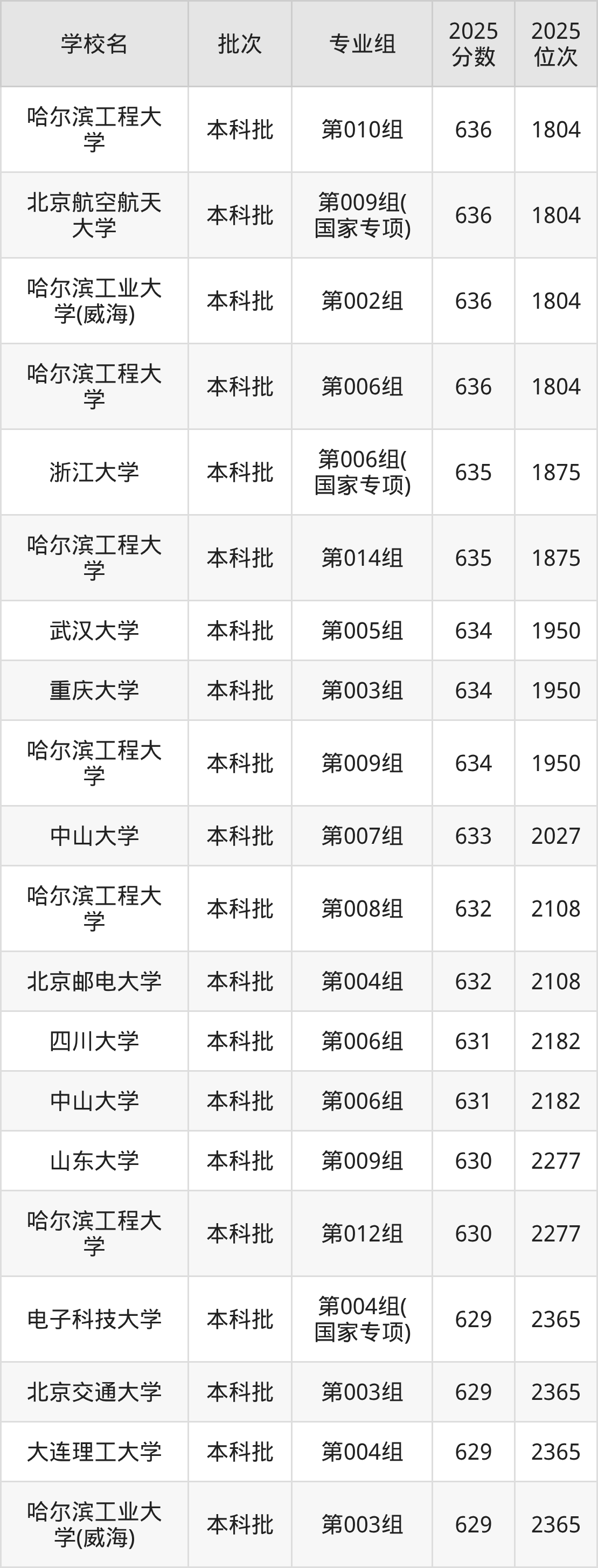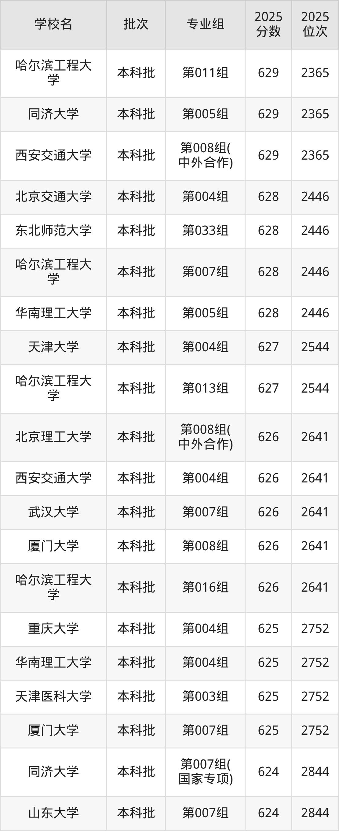 2025年黑龙江高考物理类629分(2278名~2365名)能上的大学有北京交通大学第003组、大连理工大学第004组、哈尔滨工业大学(威海)第003组、哈尔滨工程大学第011组等。