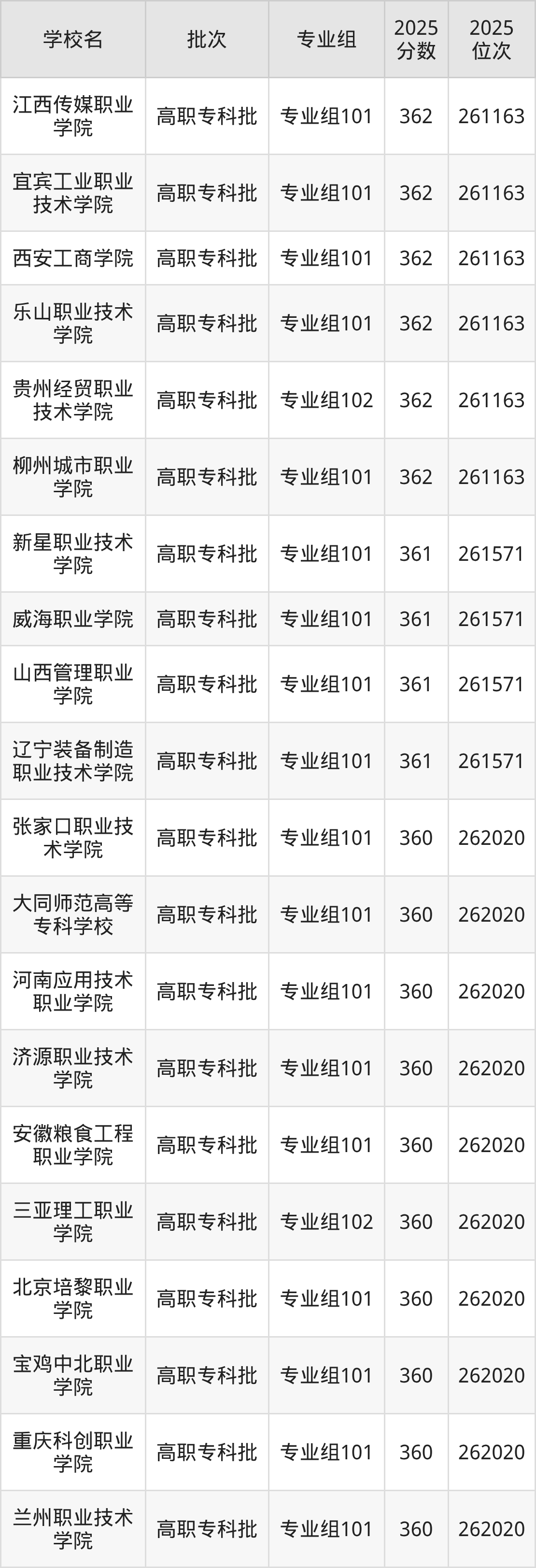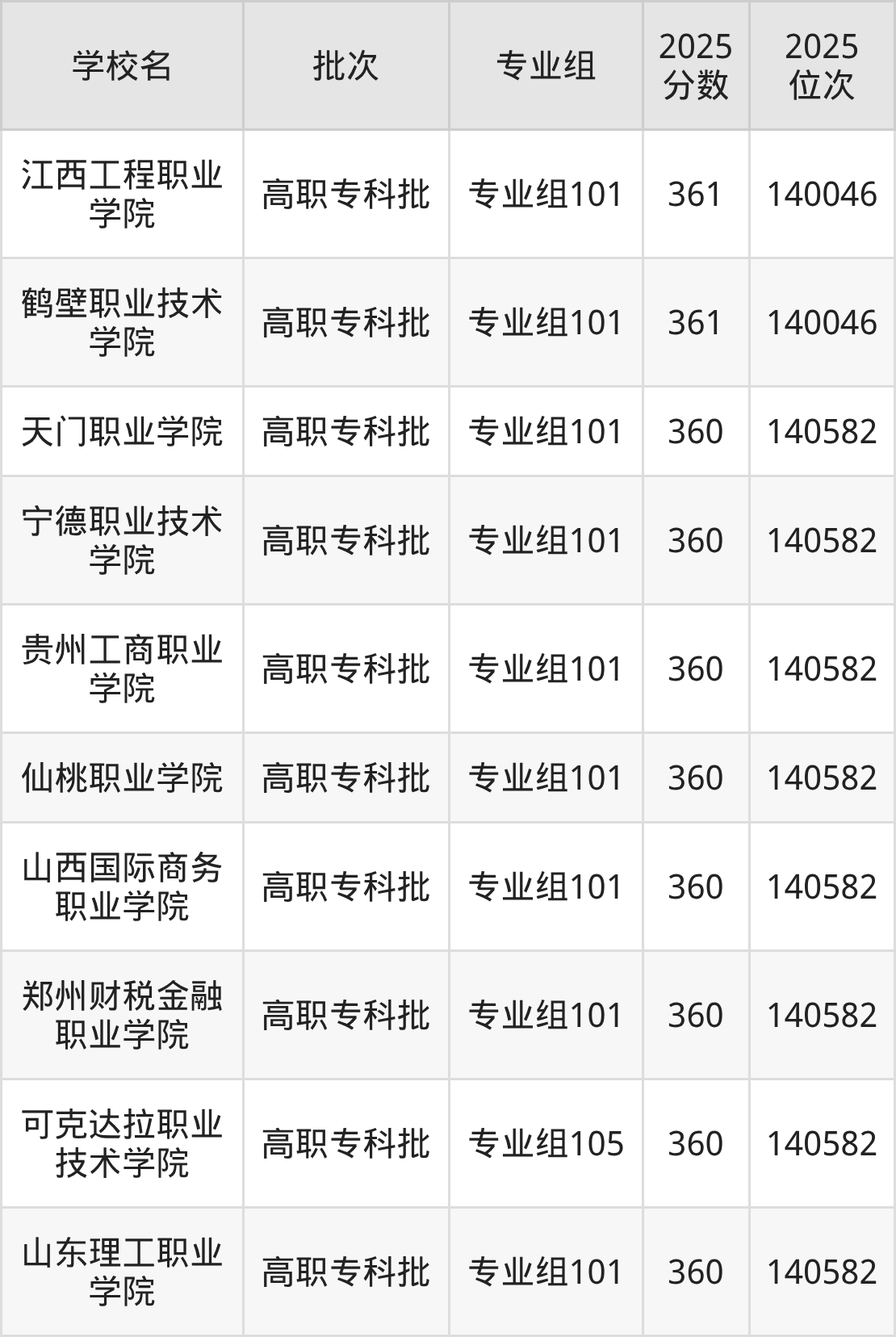 2025年四川高考历史类360分(140047名~140582名)能上的大学有天门职业学院专业组101、宁德职业技术学院专业组101、贵州工商职业学院专业组101、仙桃职业学院专业组101等。