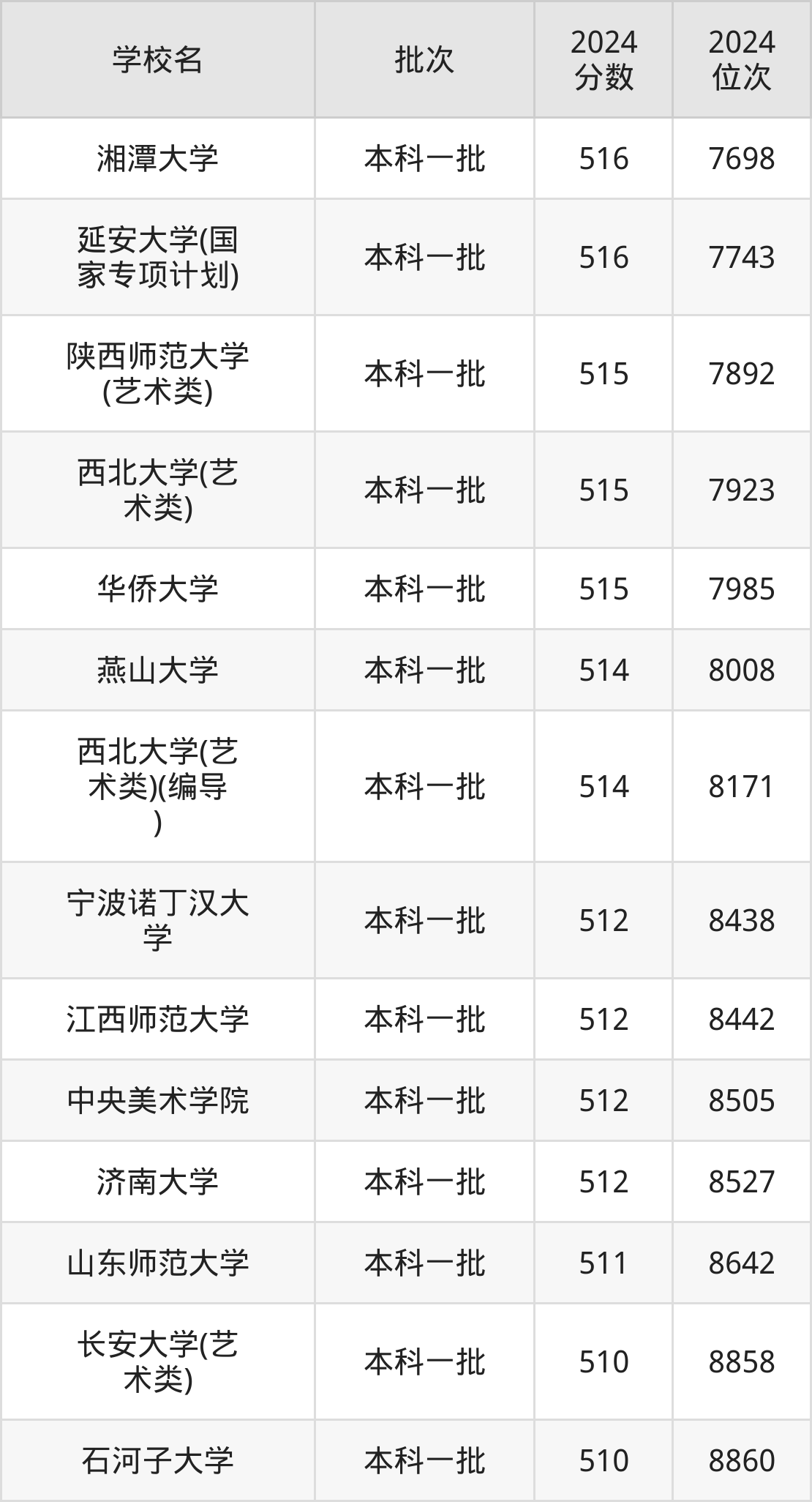 2024年陕西高考文科513分(8196名~8406名)录取位次低于该区间(较稳妥)的有宁波诺丁汉大学(8438名)、江西师范大学(8442名)等;录取位次高于该区间(可冲)的有西北大学(艺术类)(编导)(8171名)、燕山大学(8008名)等。