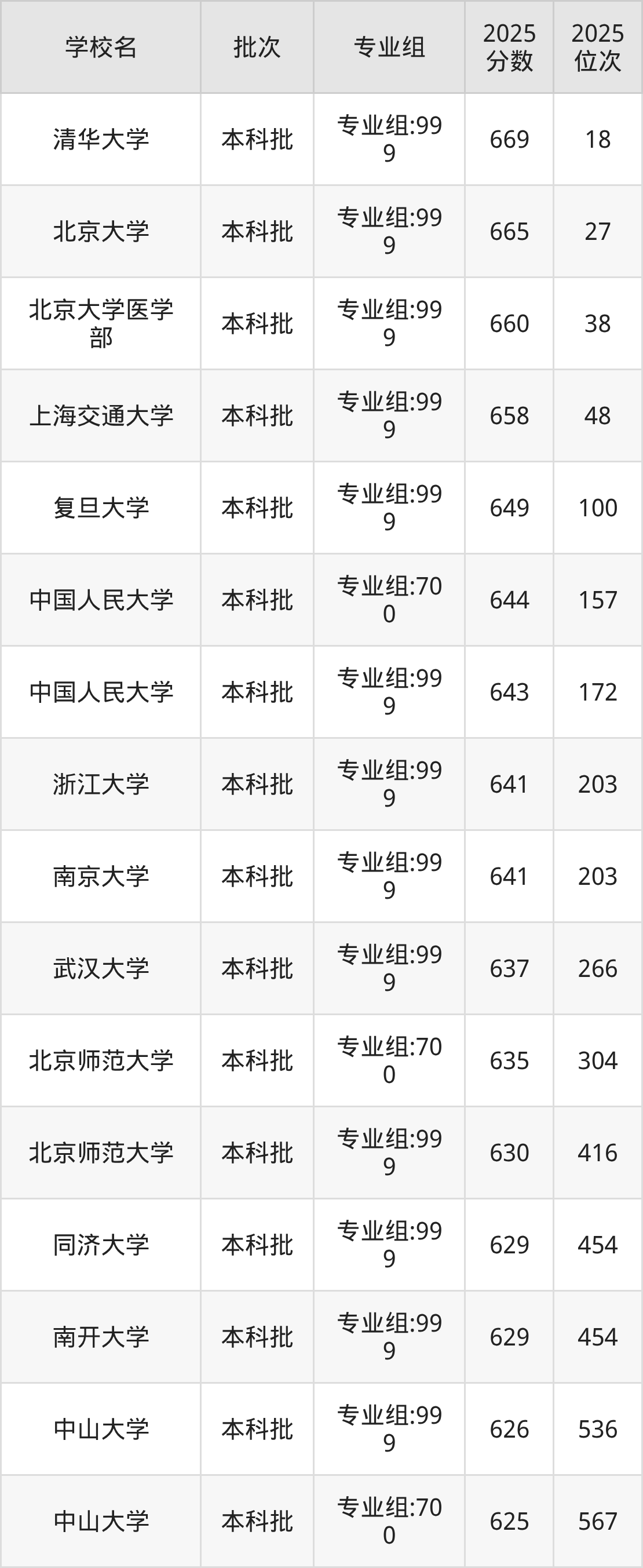 2025年福建高考历史类651分(80名~84名)录取位次低于该区间(较稳妥)的有复旦大学专业组:999(100名)、中国人民大学专业组:700(157名)等;录取位次高于该区间(可冲)的有上海交通大学专业组:999(48名)、北京大学医学部专业组:999(38名)等。