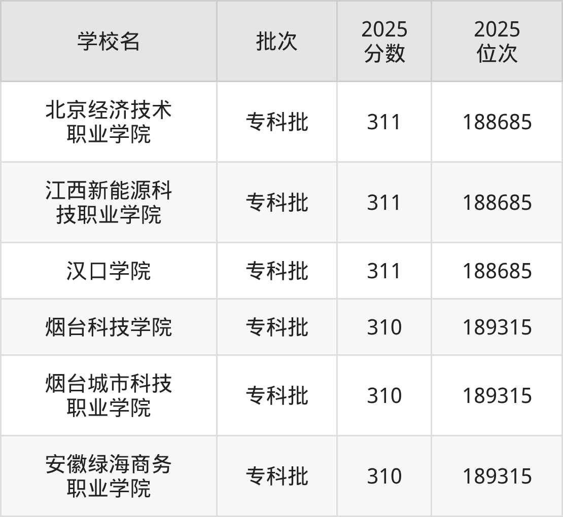 2025年河北高考历史类310分(188686名~189315名)能上的大学有烟台科技学院、烟台城市科技职业学院、安徽绿海商务职业学院。