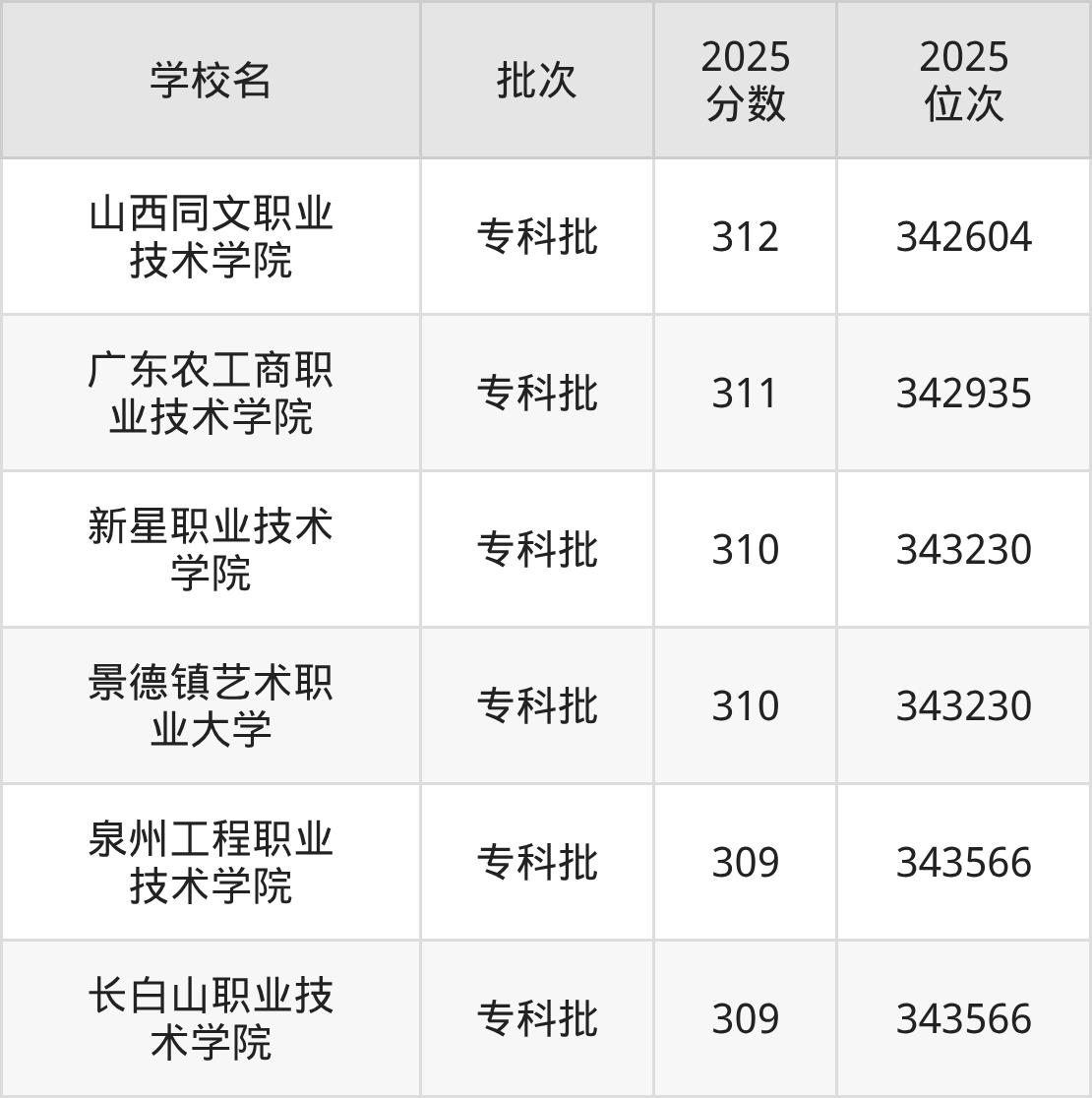 2025年河北高考物理类310分(342936名~343230名)能上的大学有景德镇艺术职业大学、新星职业技术学院。