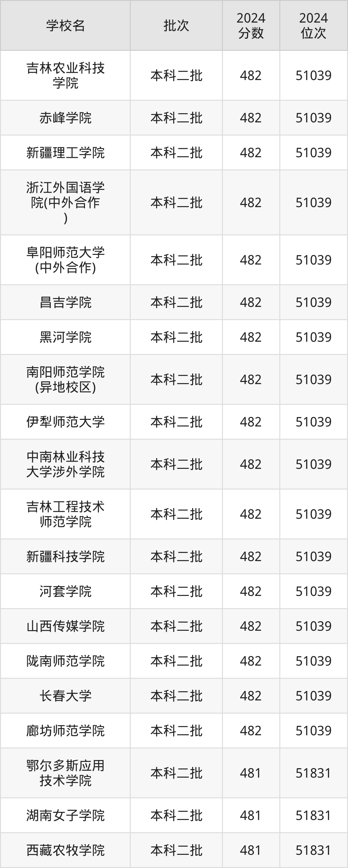 这些都是2025年高考文科51040名~51831名考生可以报考的大学,更多学校名单如下表所示: