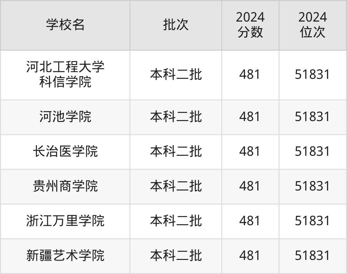 2024年河南高考文科481分(51040名~51831名)能上的大学有长治医学院、新疆艺术学院、河池学院、河北工程大学科信学院等。