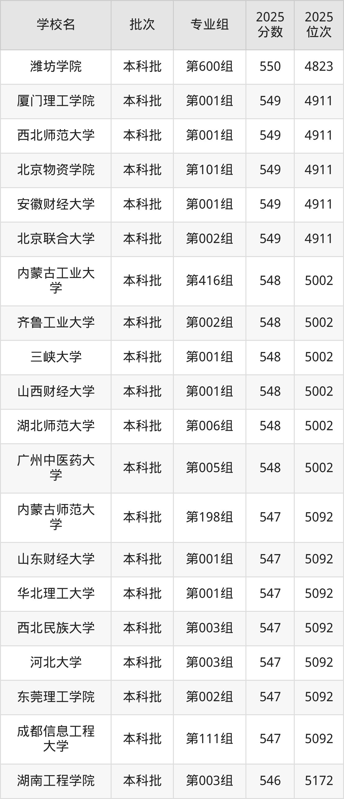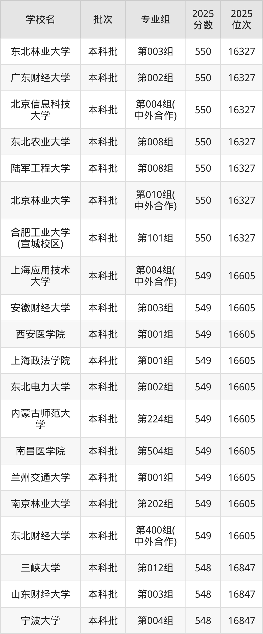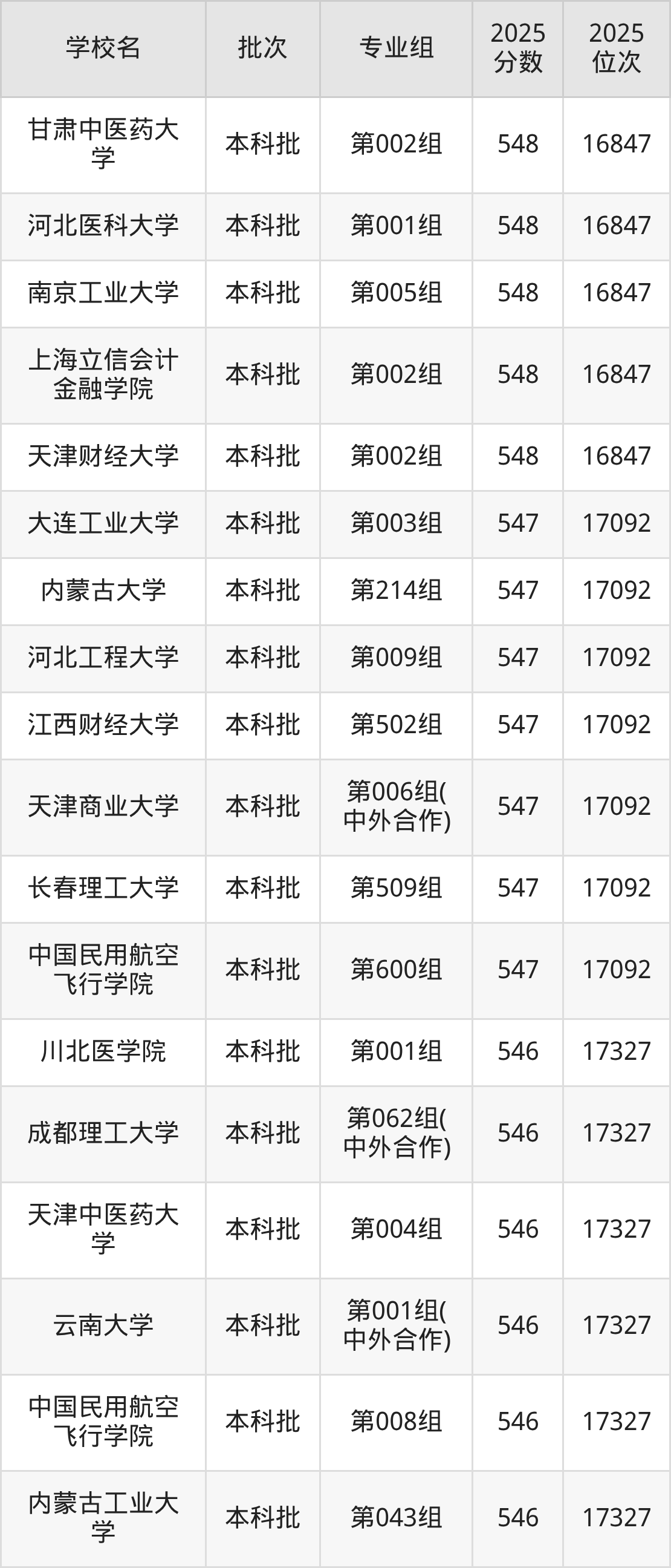 2025年内蒙古高考物理类548分(16606名~16847名)能上的大学有三峡大学第012组、上海立信会计金融学院第002组、南京工业大学第005组、河北医科大学第001组等。