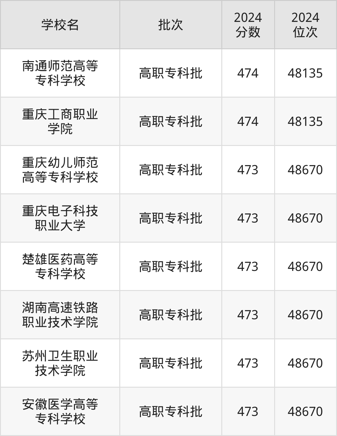 2024年云南高考文科473分(48136名~48670名)能上的大学有重庆幼儿师范高等专科学校、安徽医学高等专科学校、苏州卫生职业技术学院、湖南高速铁路职业技术学院等。