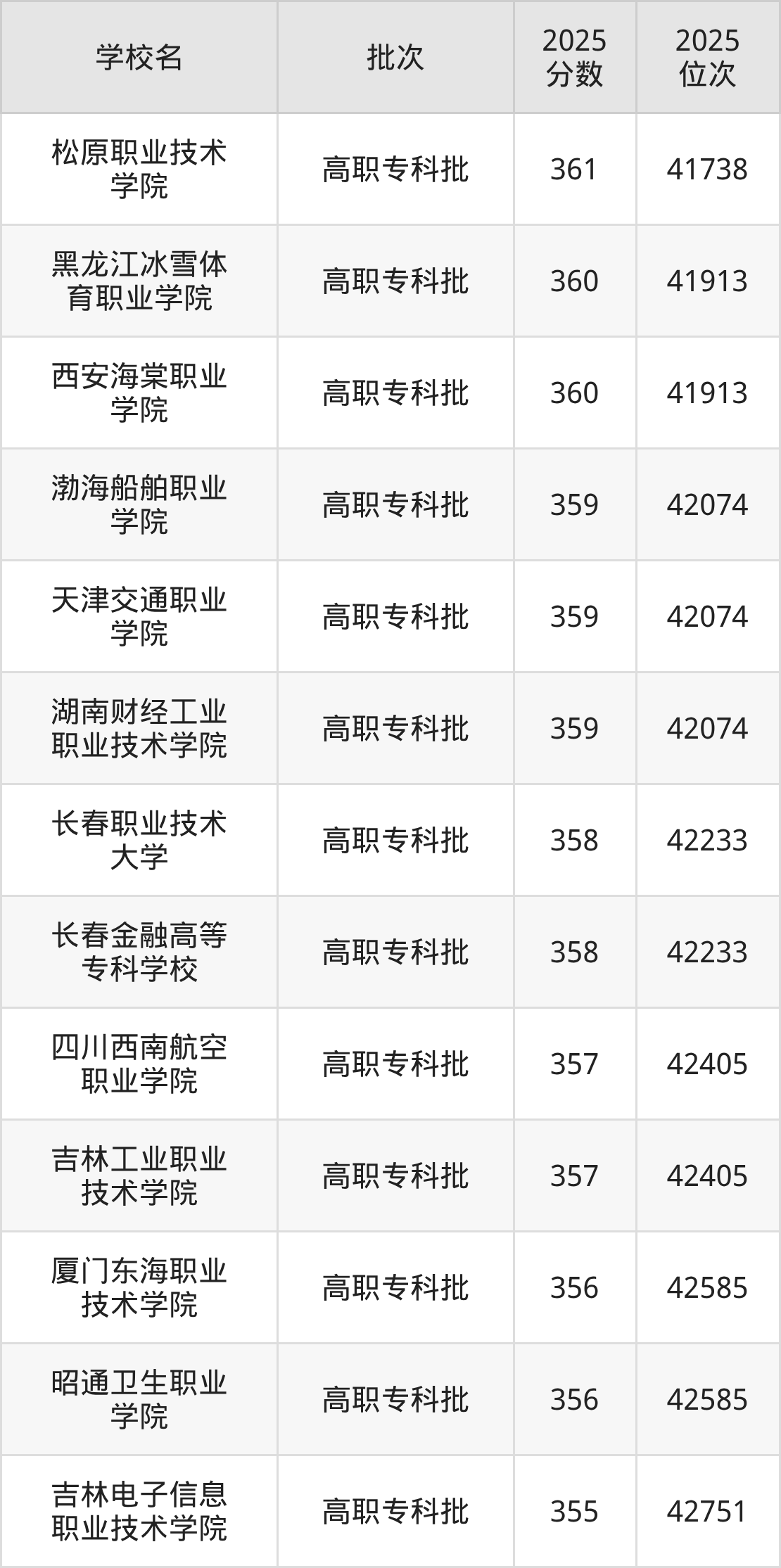 2025年辽宁高考历史类357分(42234名~42405名)能上的大学有吉林工业职业技术学院、四川西南航空职业学院。