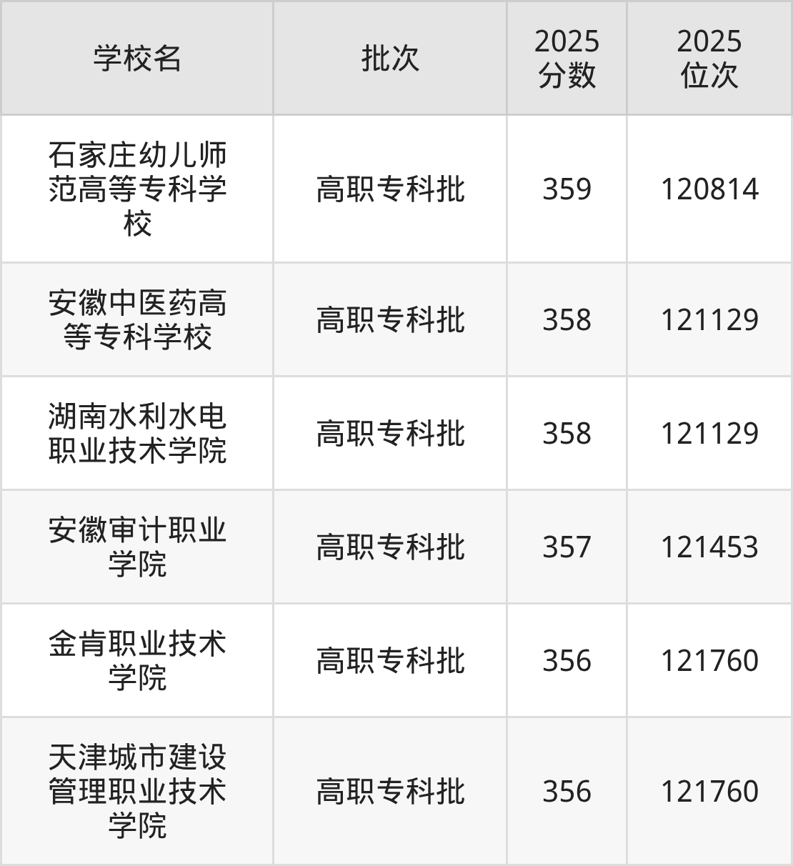 另外录取位次低于该区间(较稳妥)的有金肯职业技术学院(121760名)、天津城市建设管理职业技术学院(121760名)等;录取位次高于该区间(可冲)的有安徽中医药高等专科学校(121129名)、湖南水利水电职业技术学院(121129名)等。