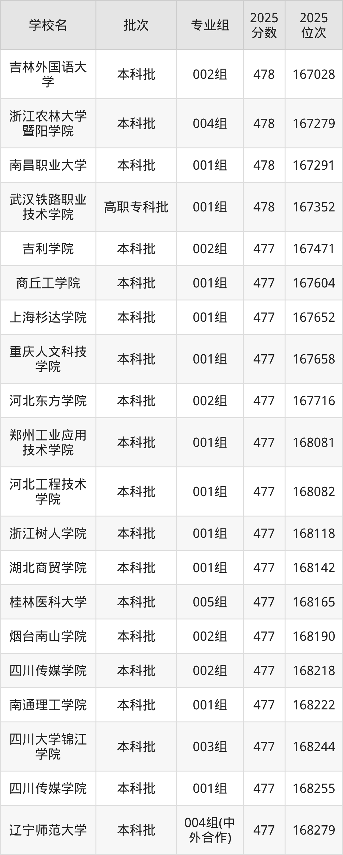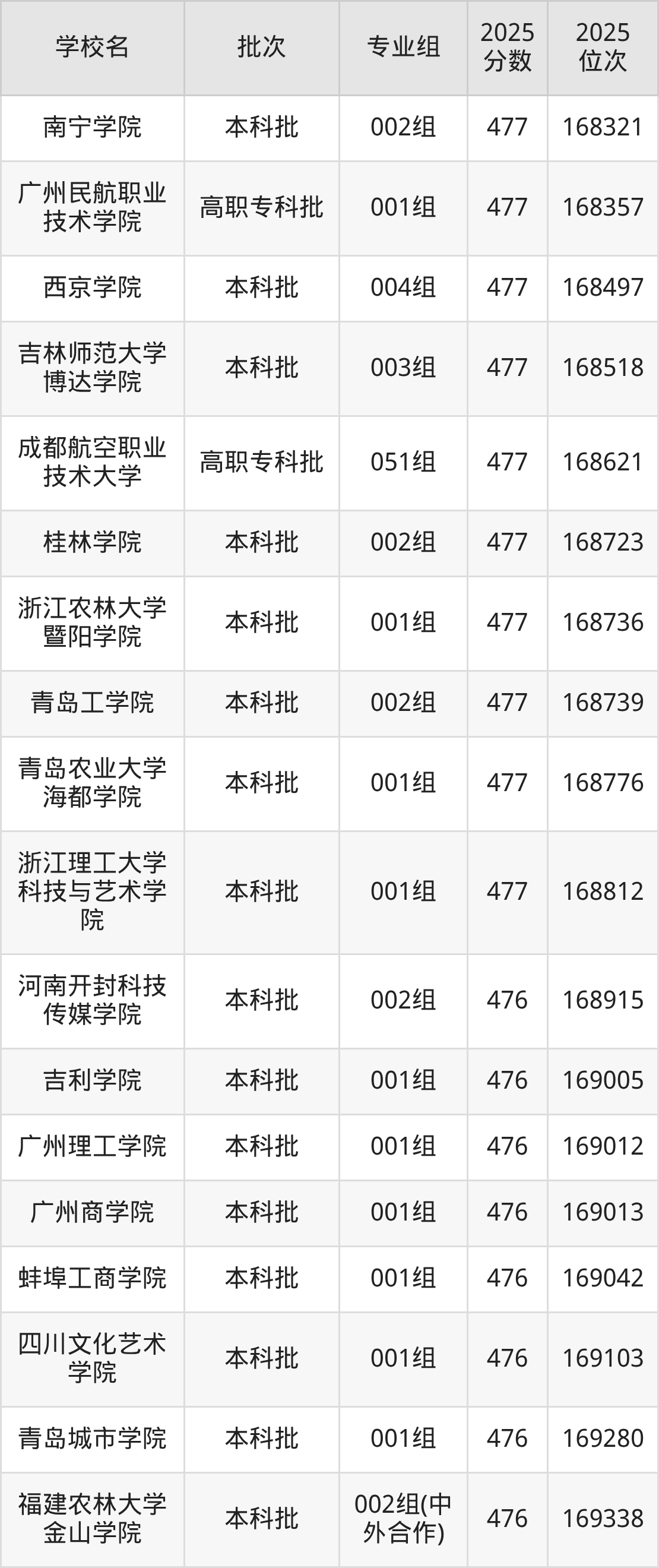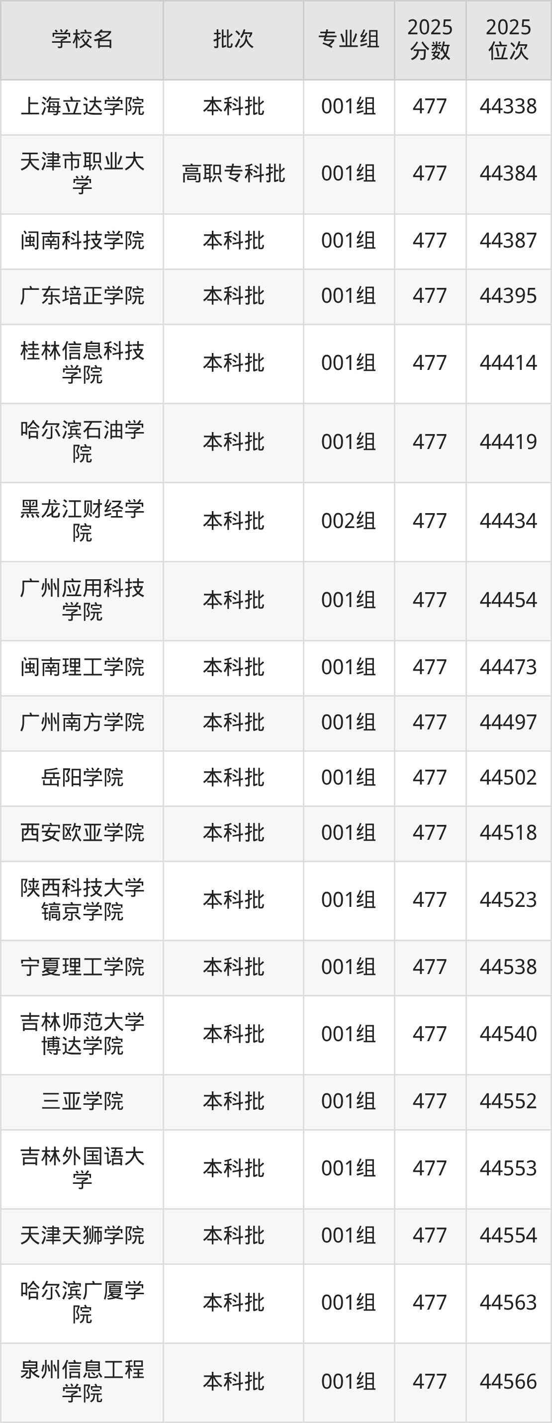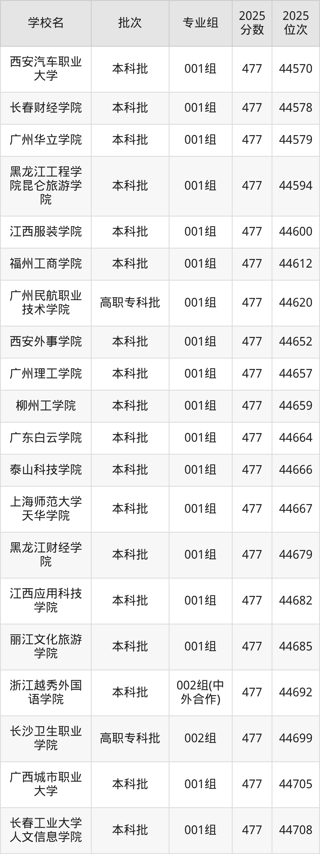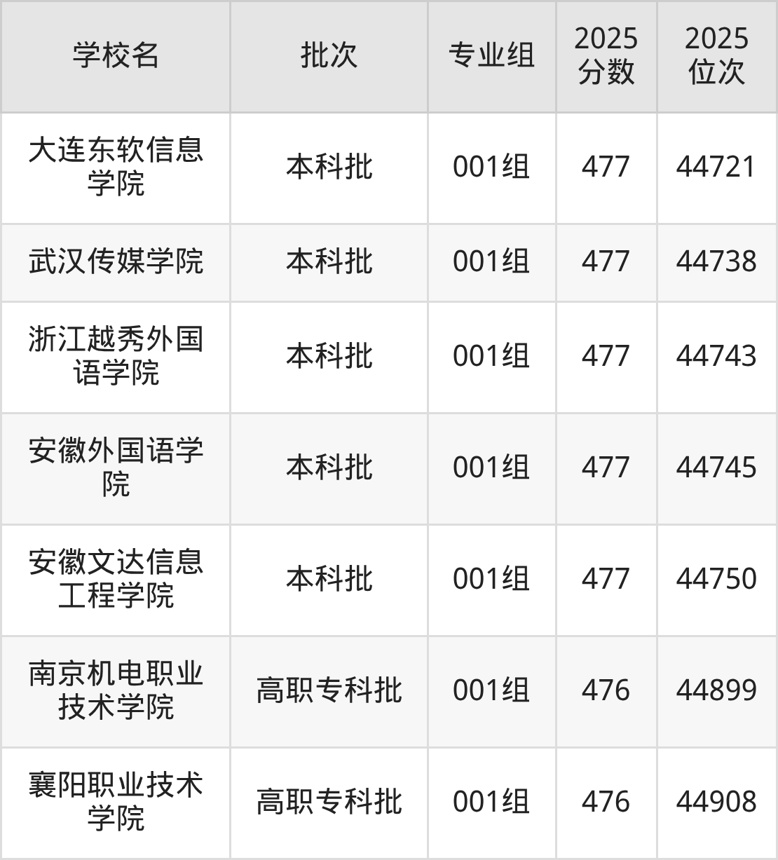 2025年安徽高考历史类477分(44262名~44750名)能上的大学有长春财经学院001组、大连东软信息学院001组、福州工商学院001组、广东白云学院001组等。