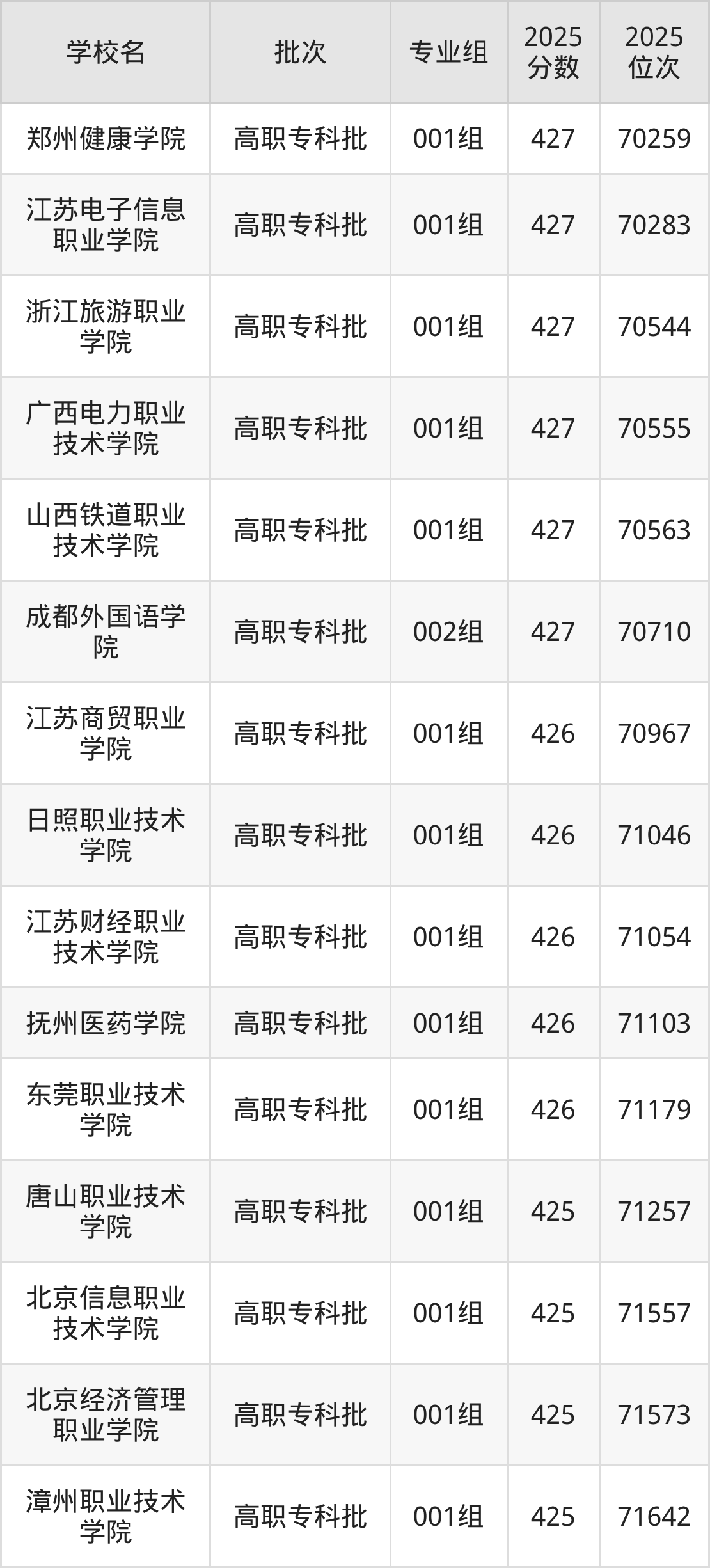 2025年安徽高考历史类426分(70715名~71230名)能上的大学有东莞职业技术学院001组、江苏财经职业技术学院001组、江苏商贸职业学院001组、抚州医药学院001组等。