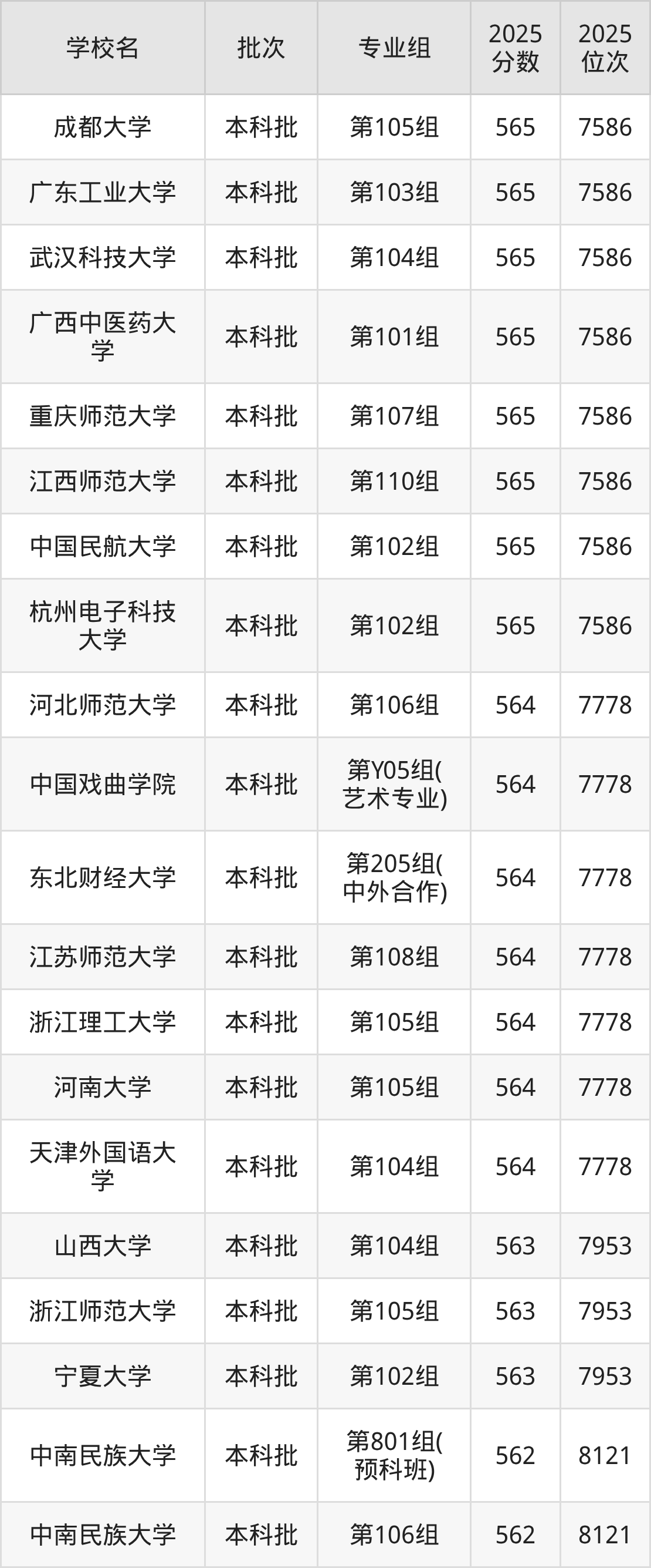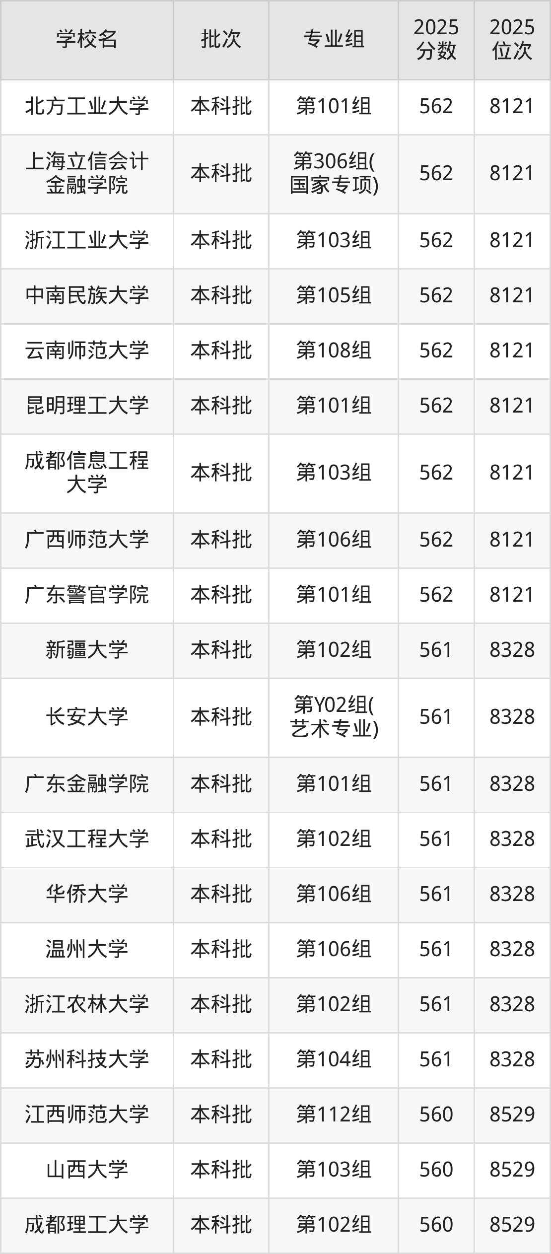 2025年湖南高考历史类562分(7954名~8121名)能上的大学有北方工业大学第101组、上海立信会计金融学院第306组(国家专项)、浙江工业大学第103组、中南民族大学第105组等。