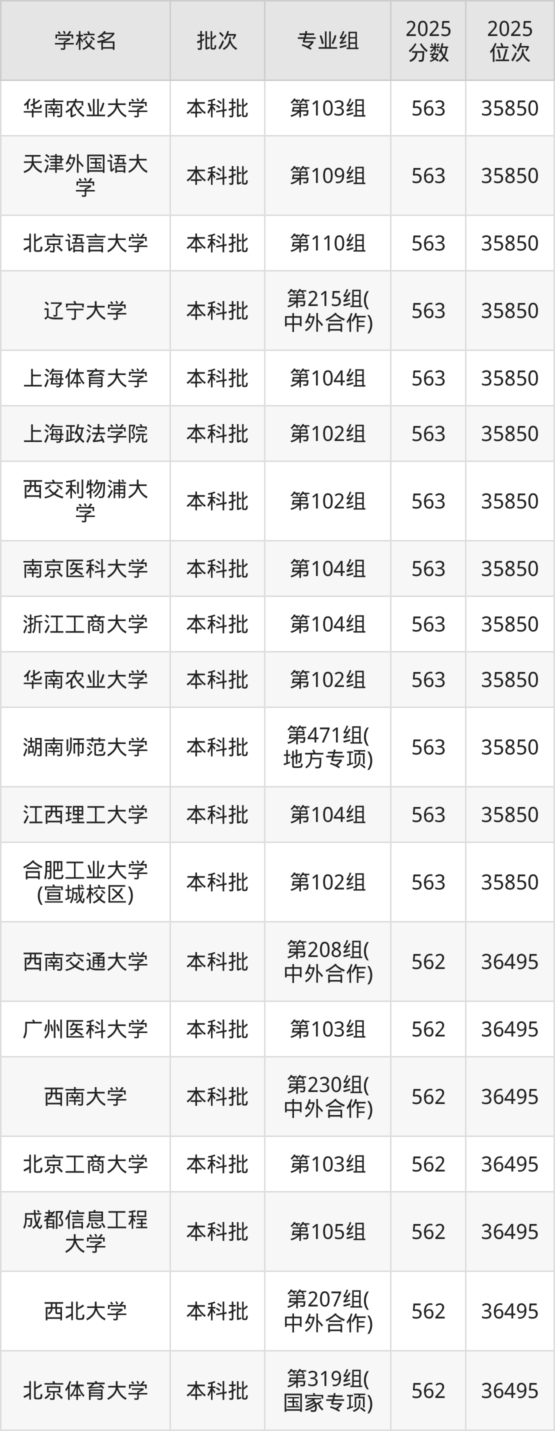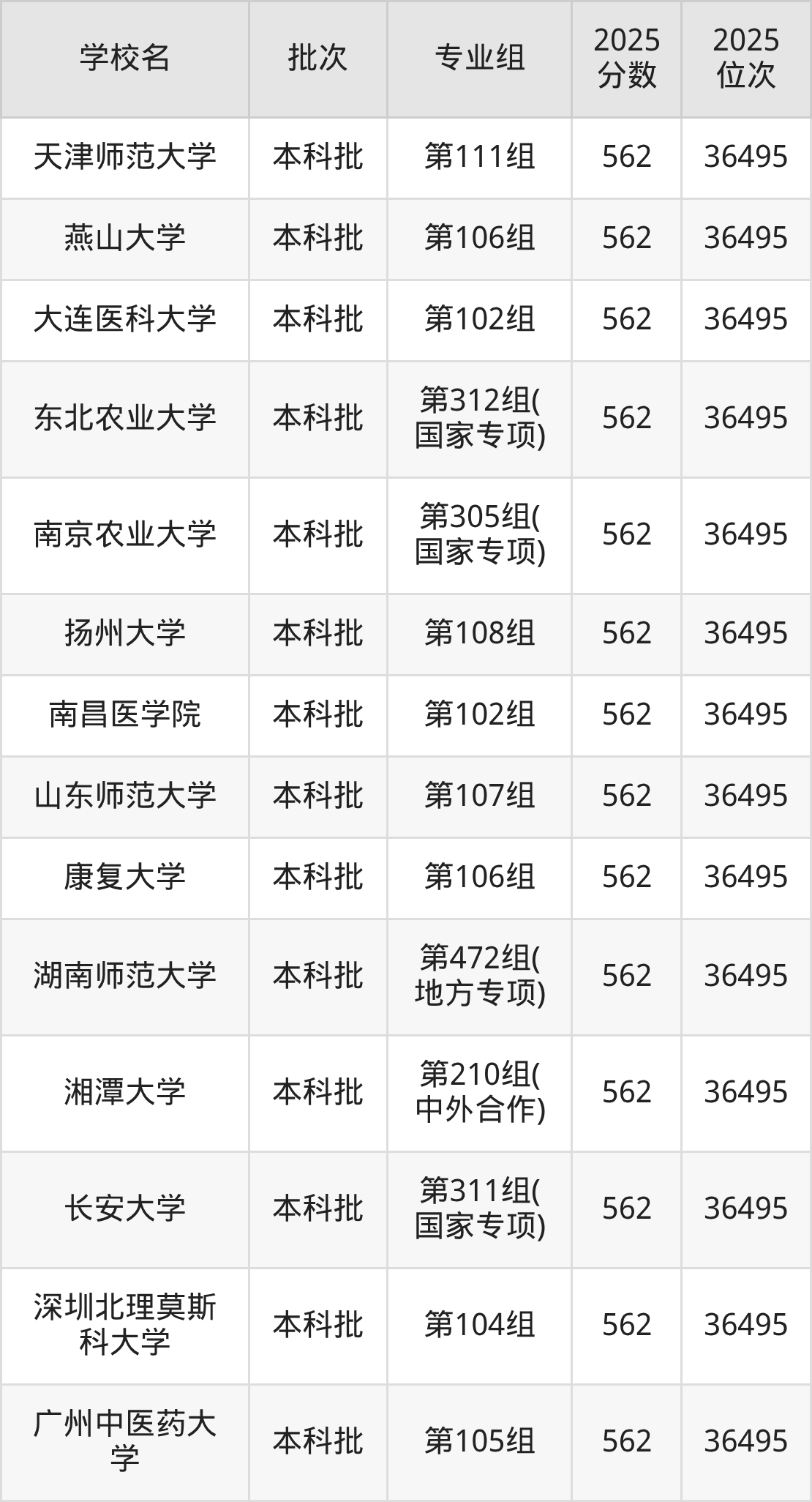 2025年湖南高考物理类562分(35851名~36495名)能上的大学有北京体育大学第319组(国家专项)、北京工商大学第103组、天津师范大学第111组、燕山大学第106组等。