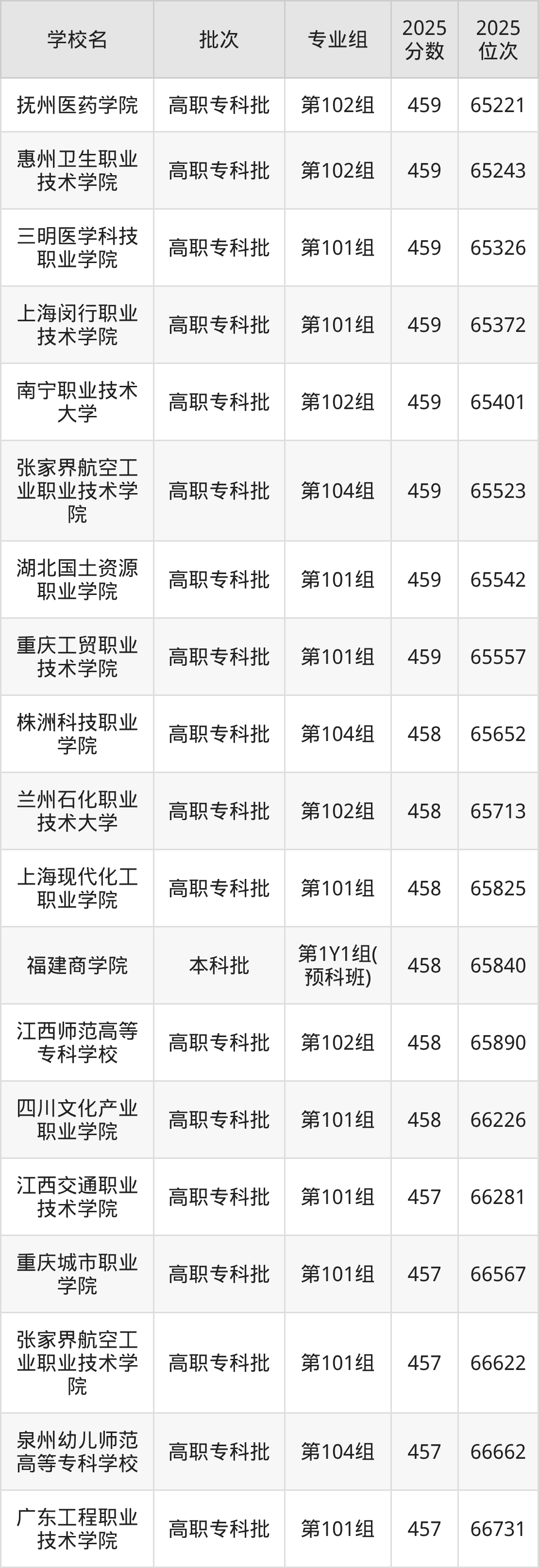 2025年江西高考历史类458分(65615名~66252名)能上的大学有福建商学院第1Y1组(预科班)、兰州石化职业技术大学第102组、上海现代化工职业学院第101组、株洲科技职业学院第104组等。