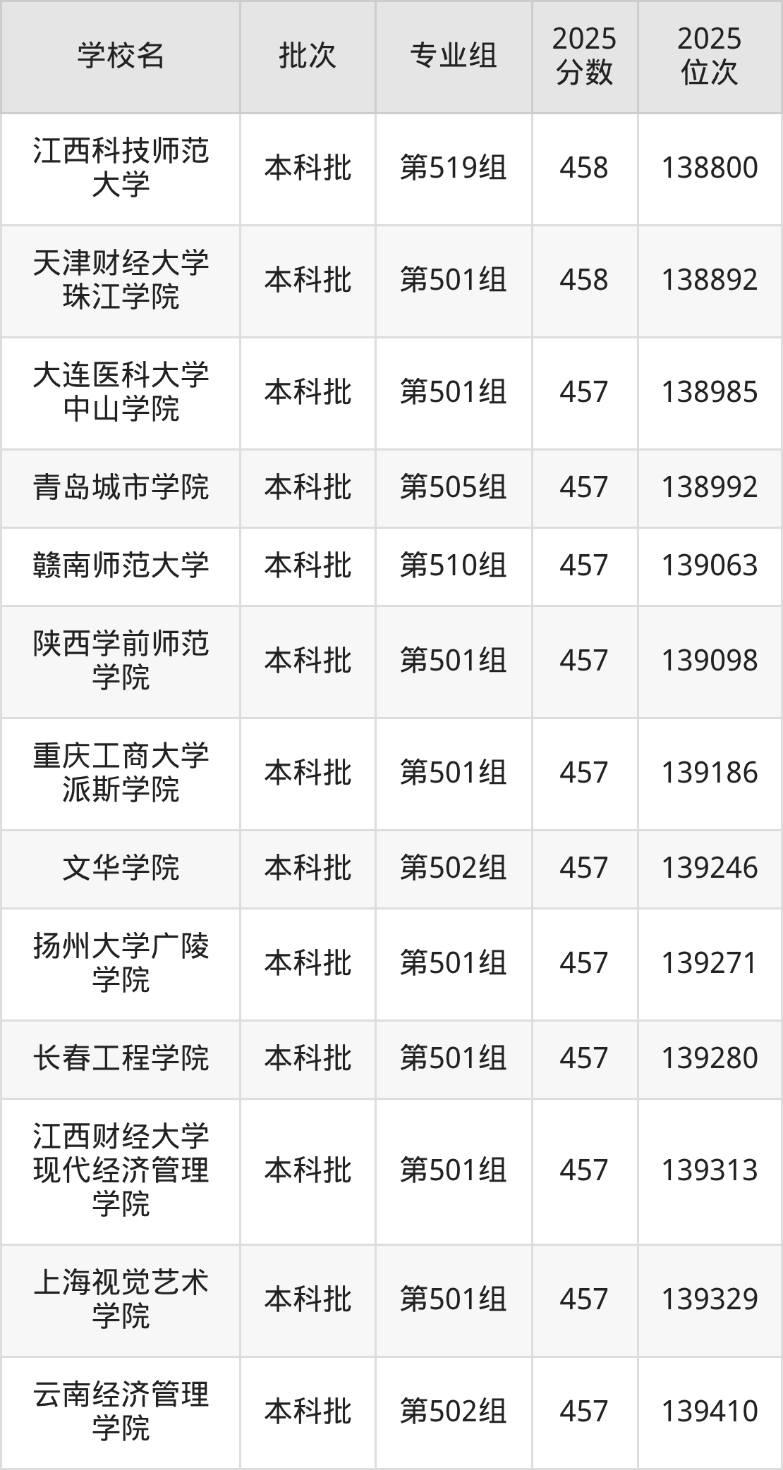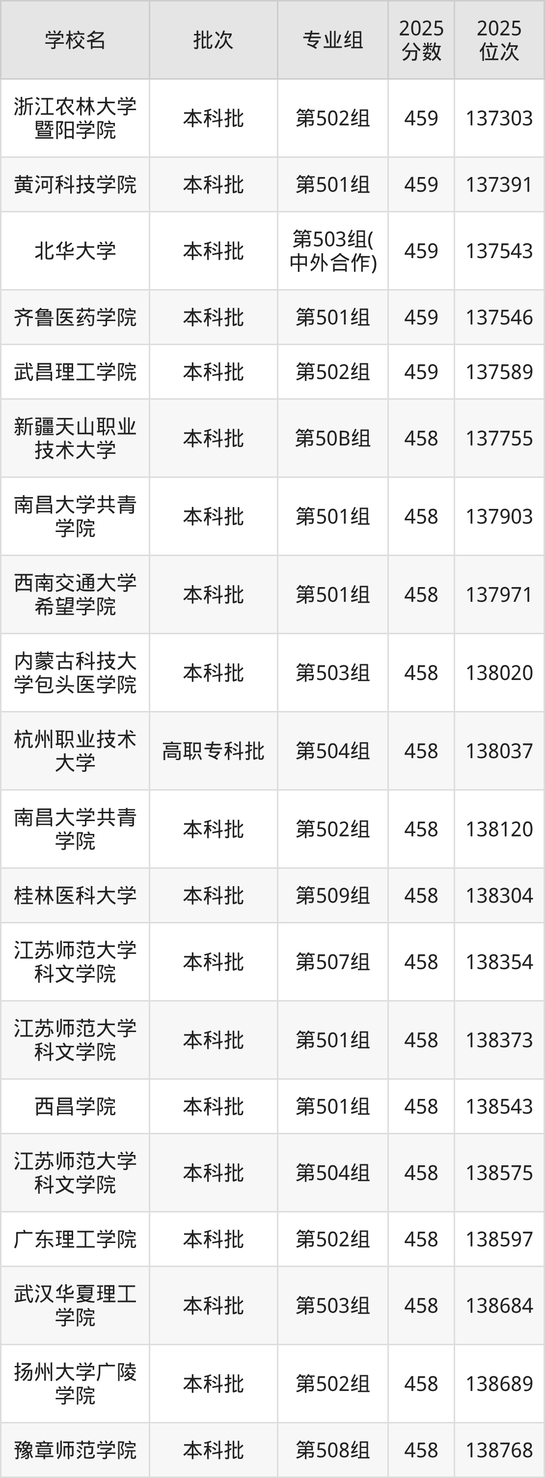 2025年江西高考物理类458分(137750名~138928名)能上的大学有内蒙古科技大学包头医学院第503组、桂林医科大学第509组、西昌学院第501组、西南交通大学希望学院第501组等。
