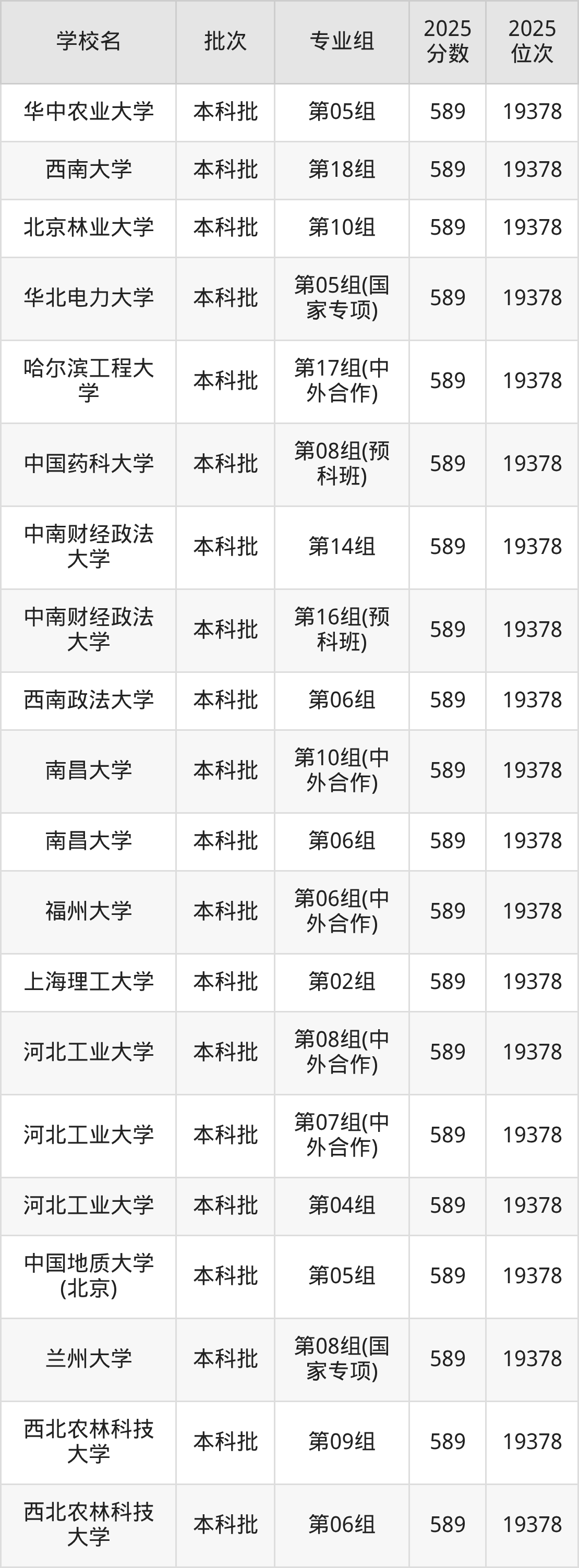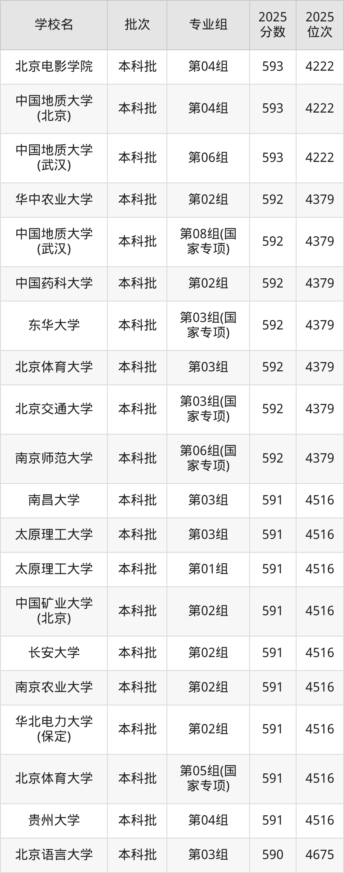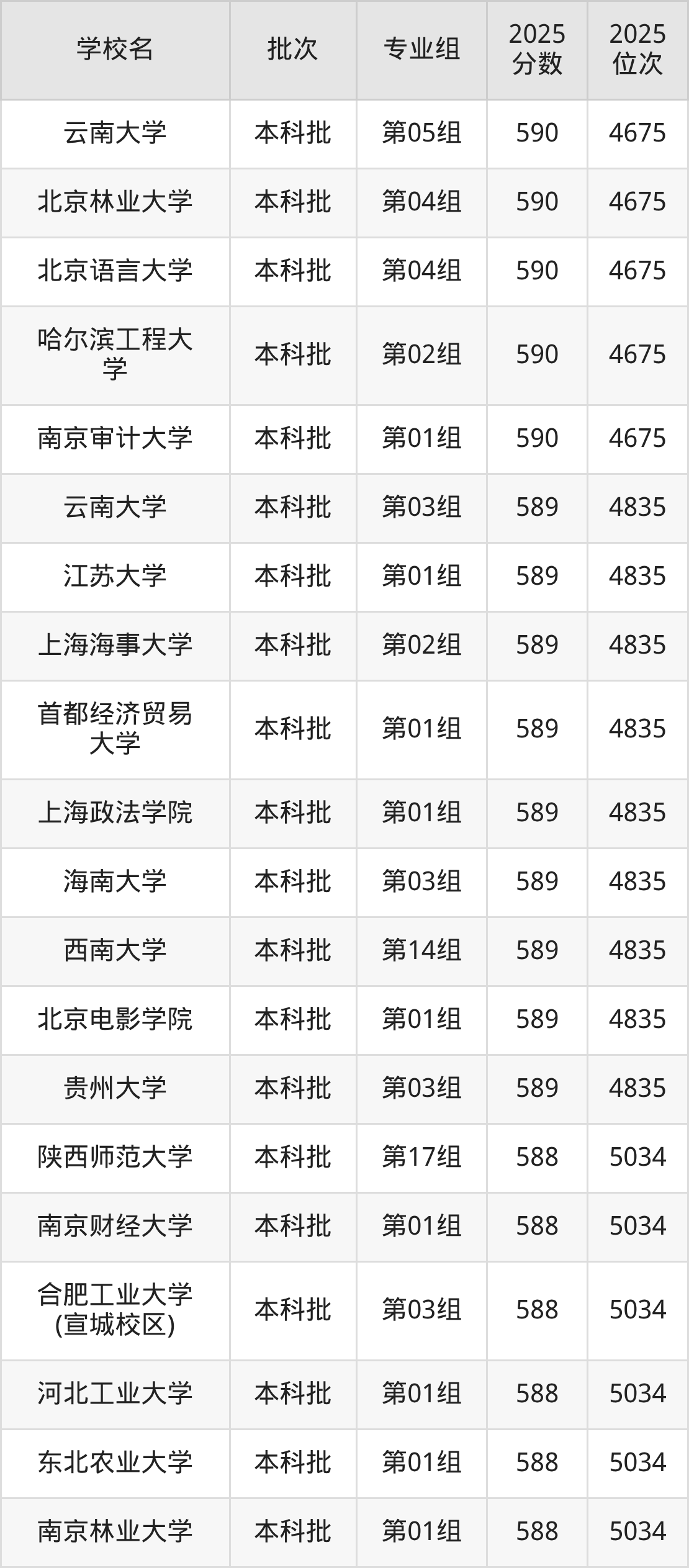 2025年湖北高考历史类590分(4517名~4675名)能上的大学有北京林业大学第04组、北京语言大学第03组、北京语言大学第04组、哈尔滨工程大学第02组等。