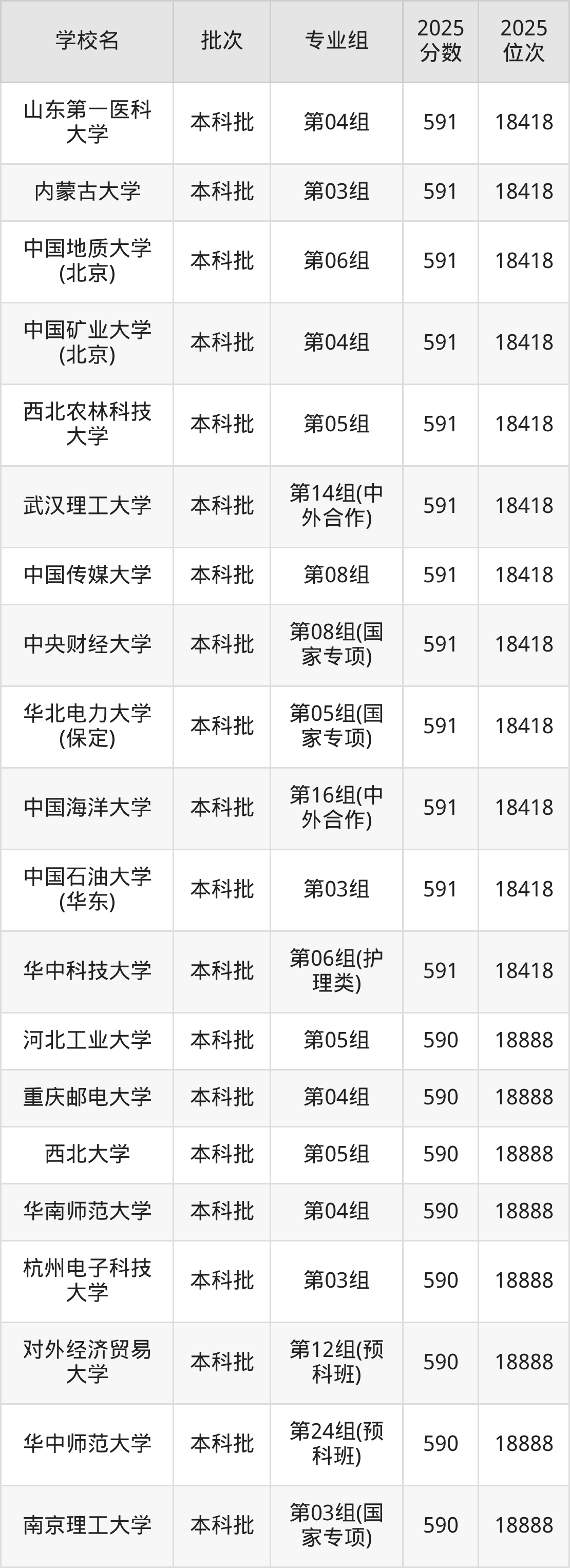 2025年湖北高考物理类590分(18419名~18888名)能上的大学有对外经济贸易大学第12组(预科班)、南京理工大学第03组(国家专项)、华中师范大学第24组(预科班)、河北工业大学第05组等。