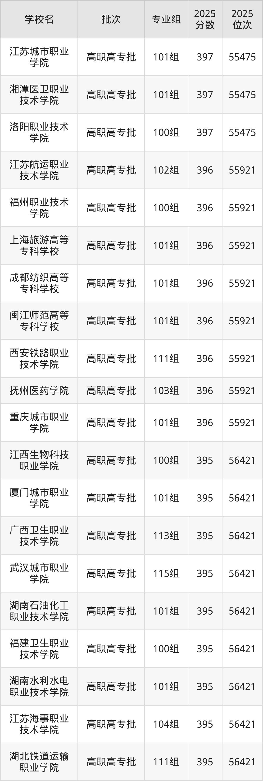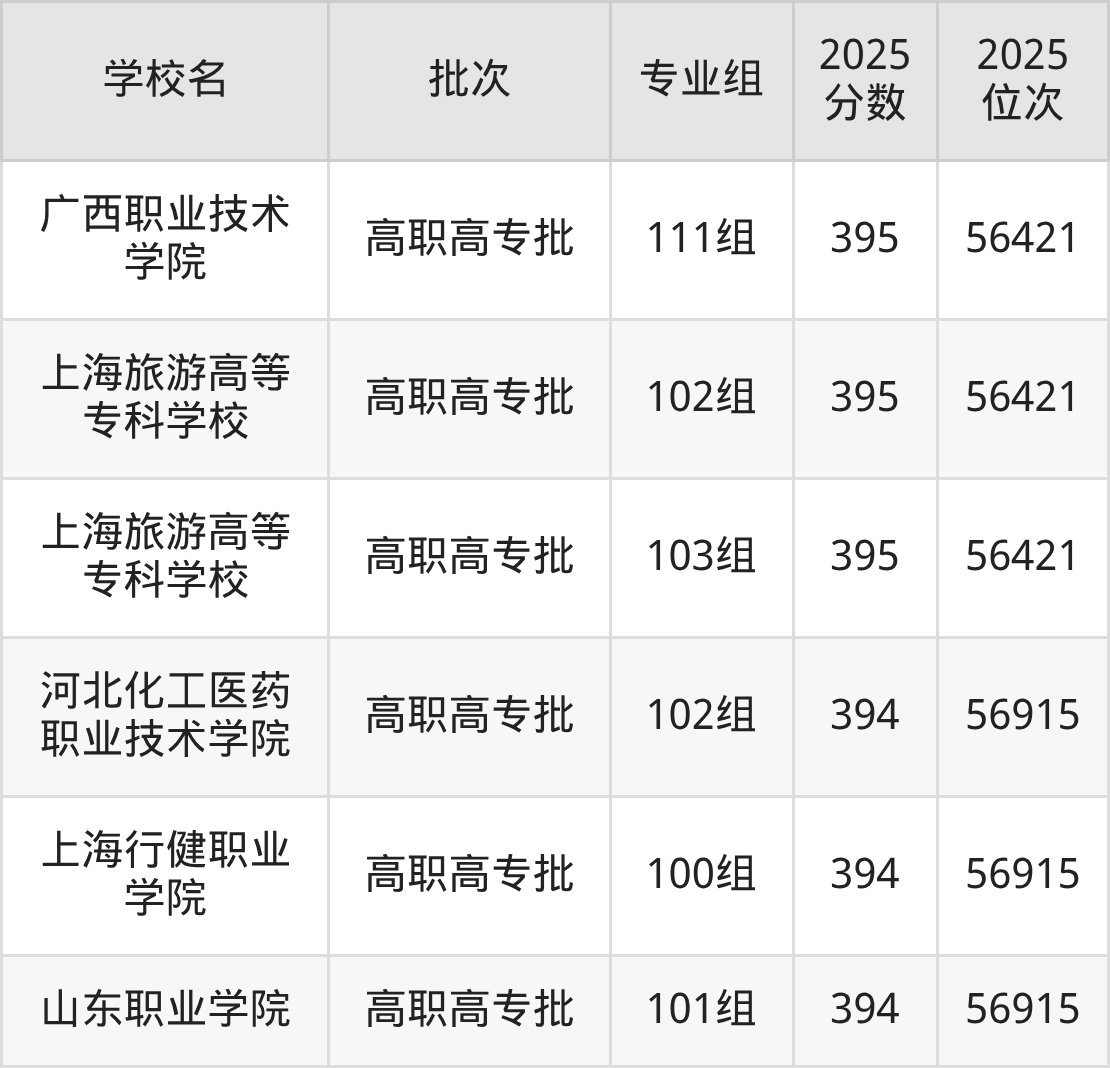 2025年广西高考历史类395分(55922名~56421名)能上的大学有上海旅游高等专科学校102组、上海旅游高等专科学校103组、广西职业技术学院111组、武汉城市职业学院115组等。