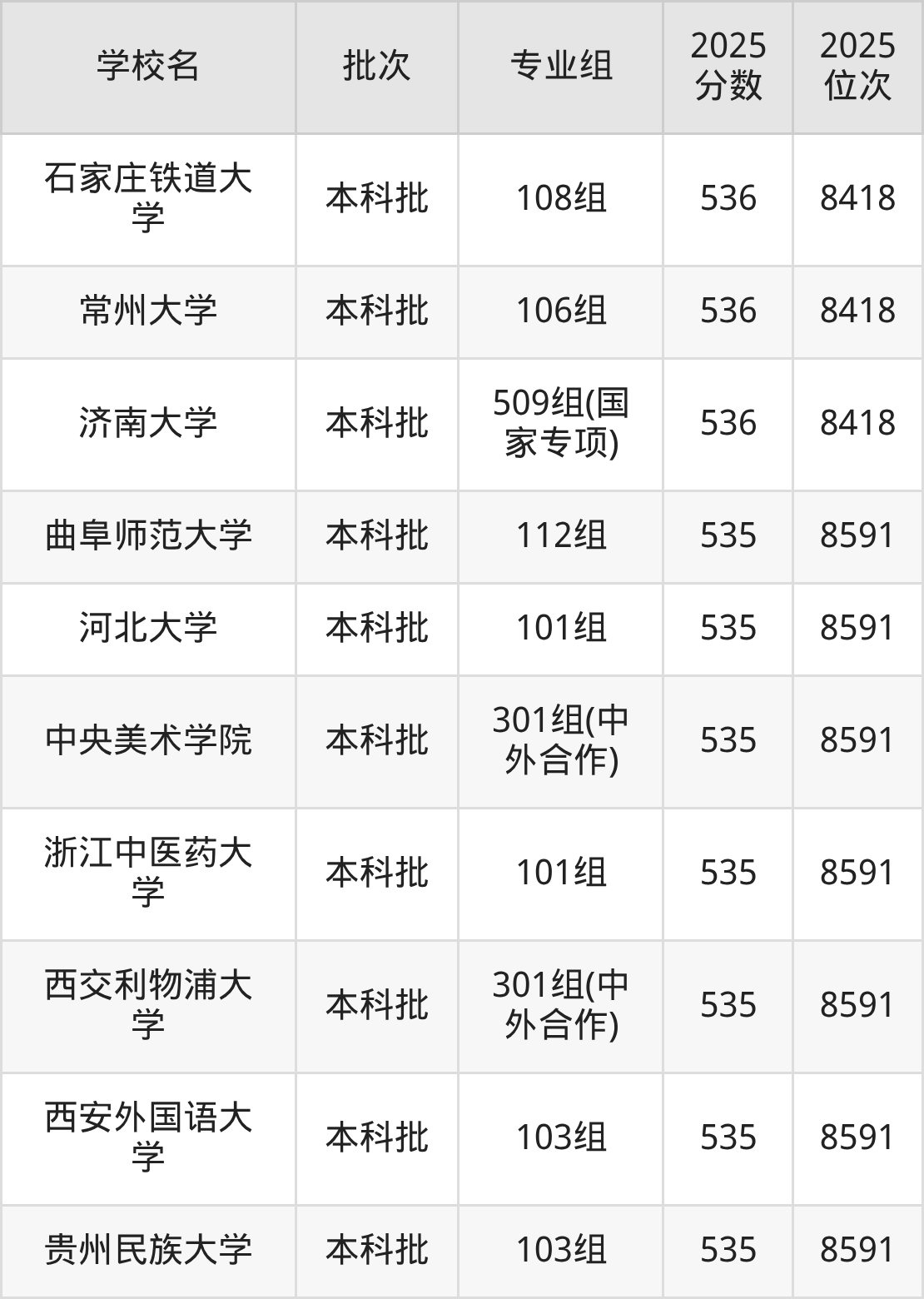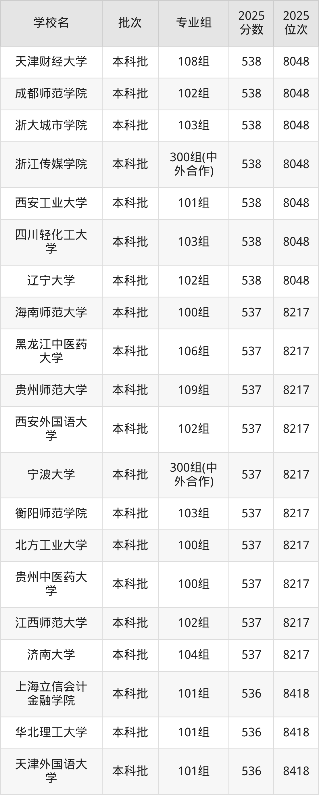 2025年广西高考历史类537分(8049名~8217名)能上的大学有北方工业大学100组、黑龙江中医药大学106组、江西师范大学102组、济南大学104组等。