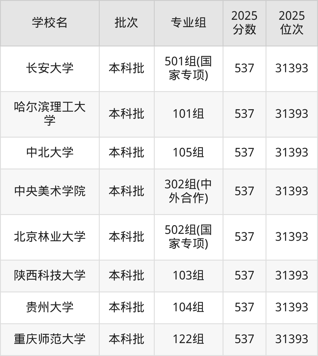 2025年广西高考物理类537分(30871名~31393名)能上的大学有北京林业大学502组(国家专项)、中央美术学院302组(中外合作)、中北大学105组、哈尔滨理工大学101组等。