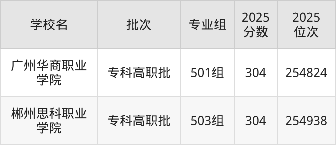 2025年广东高考历史类306分(253277名~253963名)录取位次低于该区间(较稳妥)的有广州华商职业学院501组(254824名)、郴州思科职业学院503组(254938名)等;录取位次高于该区间(可冲)的有廊坊燕京职业技术学院506组(中外合作)(252054名)、三亚城市职业学院511组(中外合作)(251925名)等。