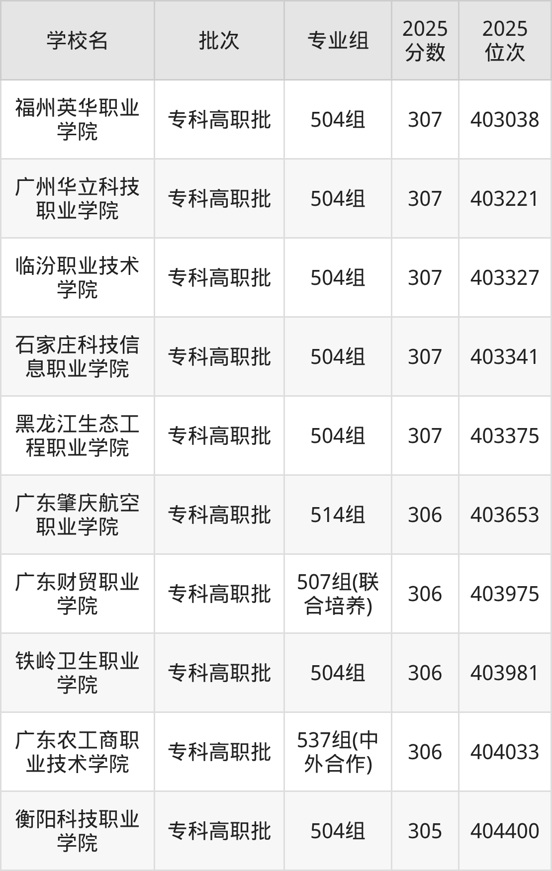 另外录取位次低于该区间(较稳妥)的有衡阳科技职业学院504组(404400名)、新疆科技职业技术学院502组(404741名)等;录取位次高于该区间(可冲)的有黑龙江生态工程职业学院504组(403375名)、石家庄科技信息职业学院504组(403341名)等。