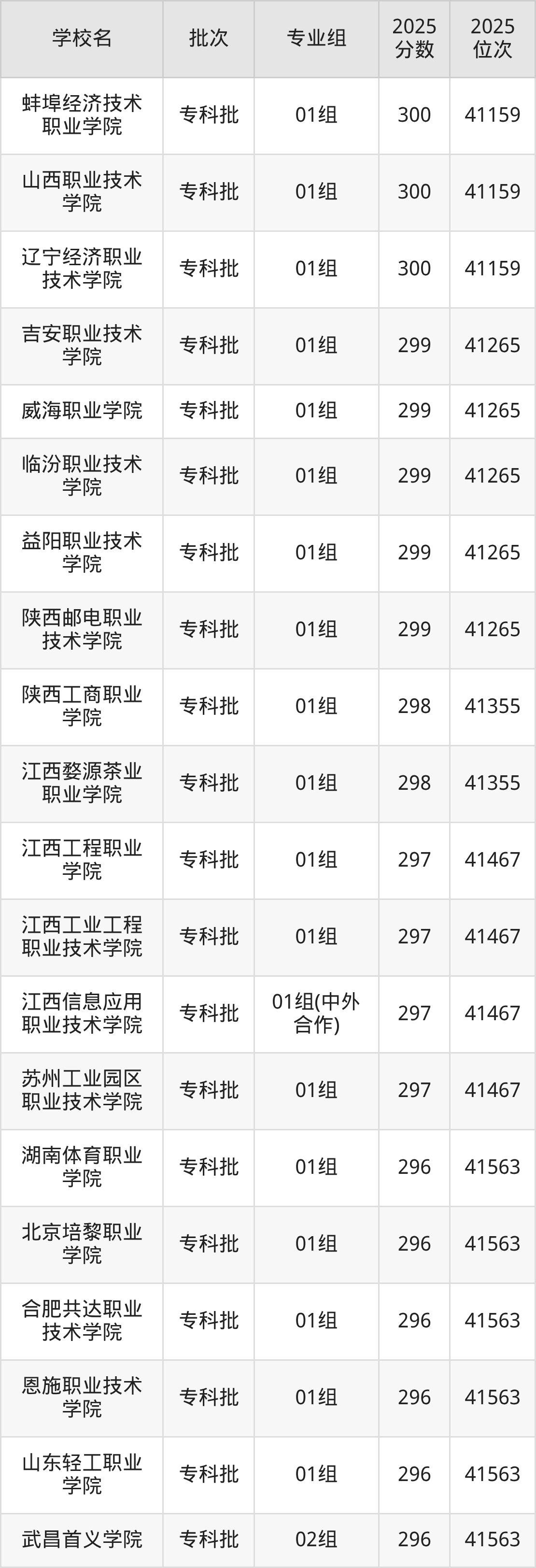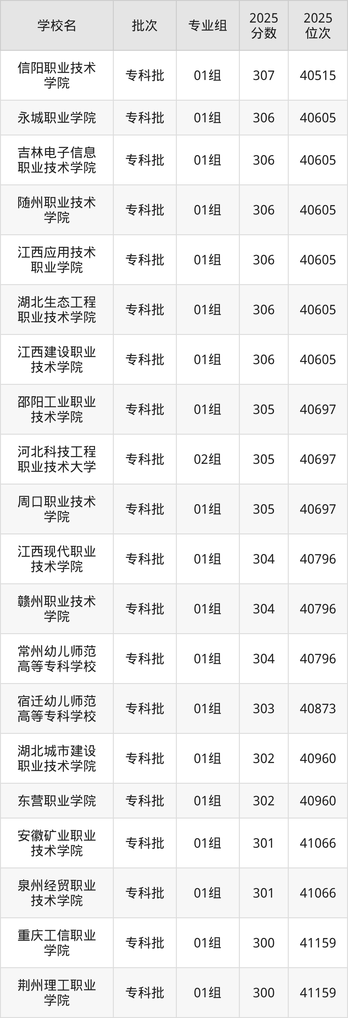 2025年江苏高考历史类301分(40961名~41066名)能上的大学有泉州经贸职业技术学院01组、安徽矿业职业技术学院01组。