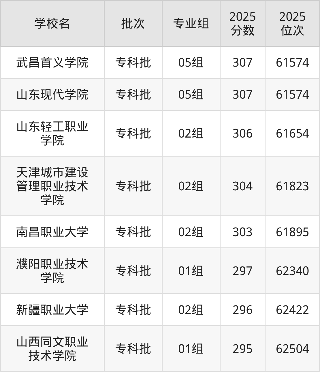 2025年江苏高考物理类301分(61971名~62046名)录取位次低于该区间(较稳妥)的有濮阳职业技术学院01组(62340名)、新疆职业大学02组(62422名)等;录取位次高于该区间(可冲)的有南昌职业大学02组(61895名)、天津城市建设管理职业技术学院02组(61823名)等。