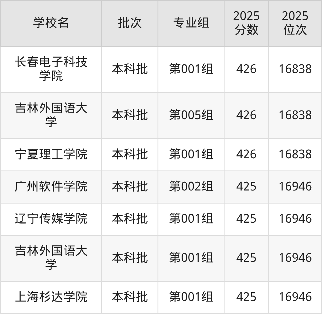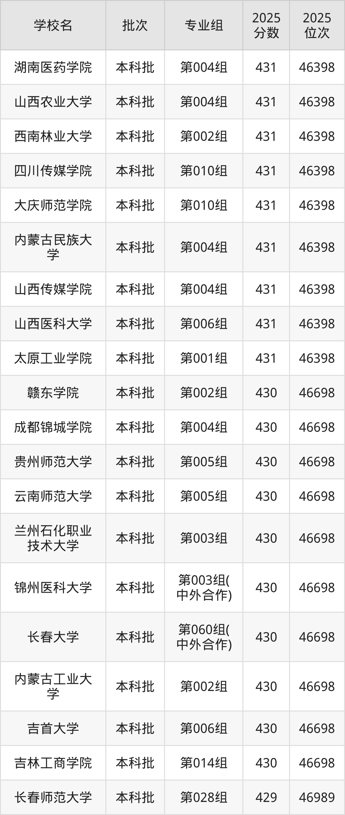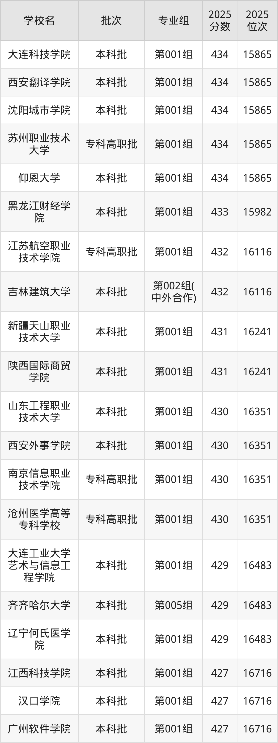 2025年吉林高考历史类429分(16352名~16483名)能上的大学有辽宁何氏医学院第001组、大连工业大学艺术与信息工程学院第001组、齐齐哈尔大学第005组。
