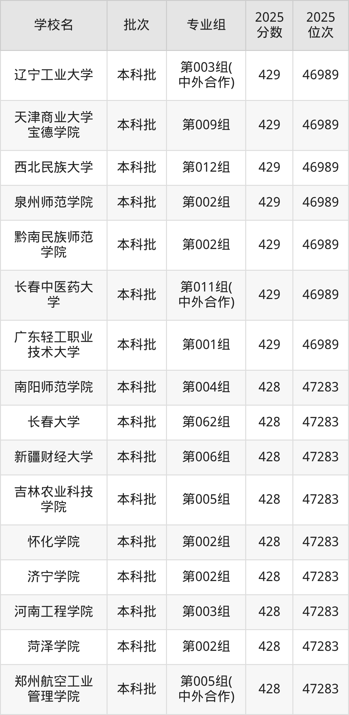2025年吉林高考物理类429分(46699名~46989名)能上的大学有天津商业大学宝德学院第009组、辽宁工业大学第003组(中外合作)、长春中医药大学第011组(中外合作)、长春师范大学第028组等。
