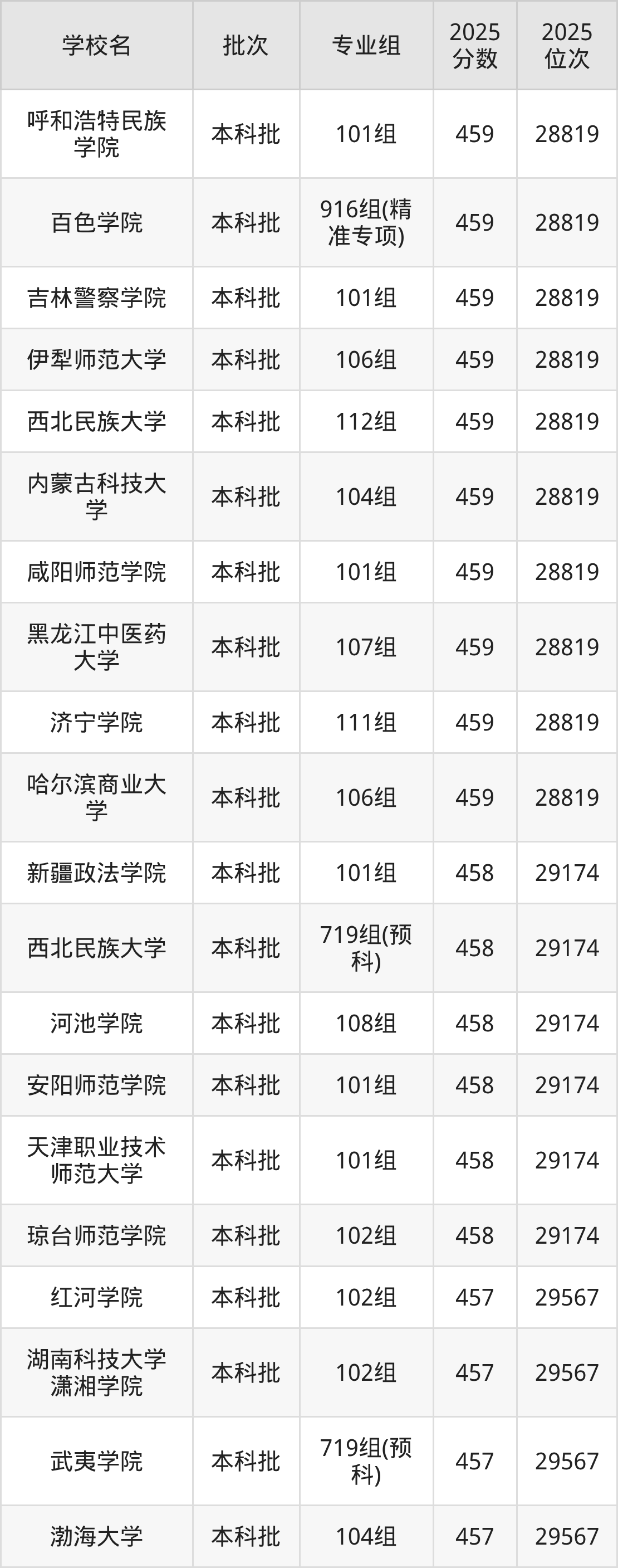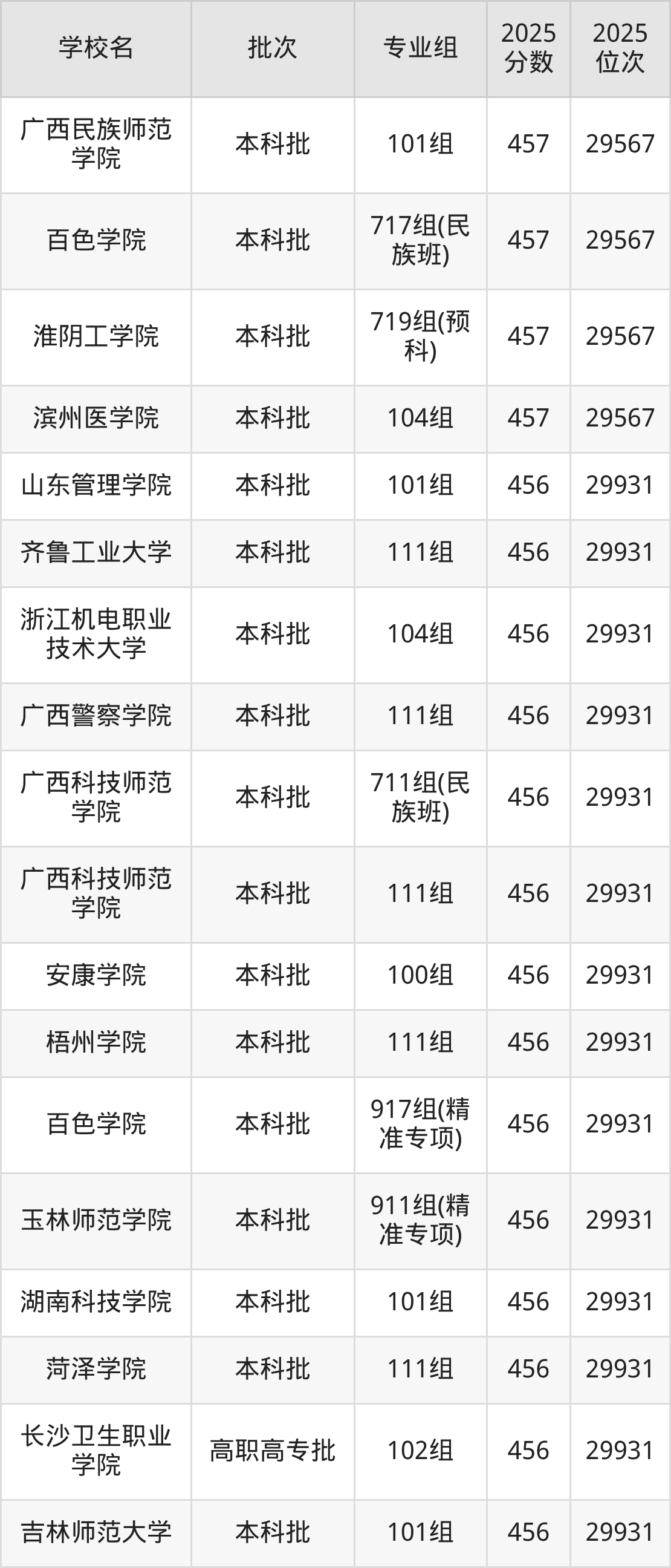 2025年广西高考历史类457分(29175名~29567名)能上的大学有渤海大学104组、武夷学院719组(预科)、滨州医学院104组、广西民族师范学院101组等。