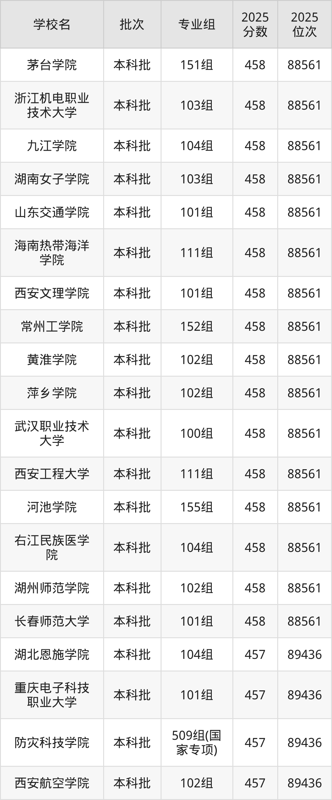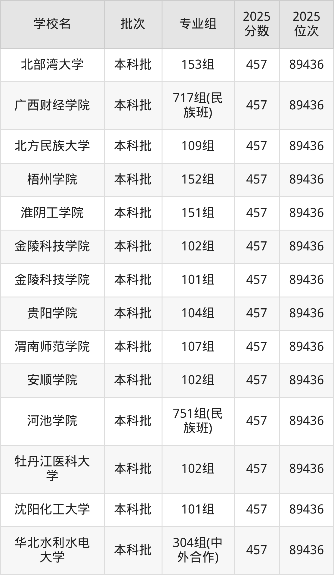 2025年广西高考物理类457分(88562名~89436名)能上的大学有华北水利水电大学304组(中外合作)、沈阳化工大学101组、牡丹江医科大学102组、河池学院751组(民族班)等。